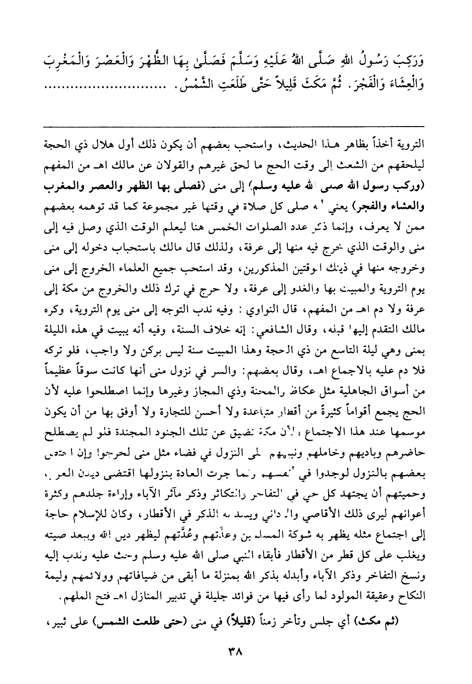 وَرَكِبَ رَسُولُ اللهِ صَلَّى اللهُ عَلَيهِ وَسَلَّمَ فَصَلَّى بِهَا الظُّهْرَ وَالْعَصْرَ وَالْمَغْرِبَ وَالْعِشَاءَ وَالْفَجْرَ. ثُمَّ مَكَثَ قَلِيلًا حَتَّى طَلَعَتِ الشَّمْسُ