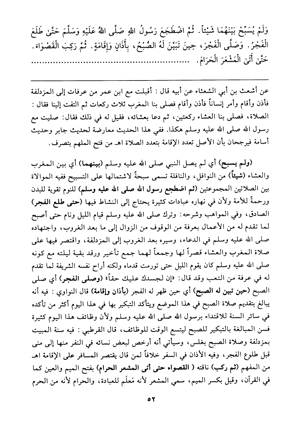 وَلَمْ يُسَبِّحْ بَينَهُمَا شَيئًا. ثُمَّ اضْطَجَعَ رَسُولُ اللهِ صَلَّى اللهُ عَلَيهِ وَسَلَّمَ حَتَّى طَلَعَ الْفَجْرُ. وَصَلَّى الْفَجْرَ، حِينَ تَبَيَّنَ لَهُ الضبْحُ، بِأَذَانِ وَإِقَامَةٍ. ثُمَّ رَكِبَ القَصْوَاءَ. حَتَّى أَتَى الْمَشْعَرَ الْحَرَامَ