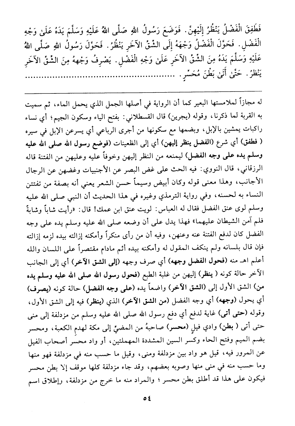 فَطَفِقَ الْفَضْلُ يَنْظُرُ إِلَيهِنَّ. فَوَضَعَ رَسُولُ اللهِ صَلَّى اللهُ عَلَيهِ وَسَلَّمَ يَدَهُ عَلَى وَجْهِ الْفَضْلِ. فَحَوَّلَ الْفَضْلُ وَجْهَهُ إِلَى الشِّقِّ الآخَرِ يَنْظُرُ. فَحَوَّلَ رَسُولُ اللهِ صَلَّى اللهُ عَلَيهِ وَسَلَّمَ يَدَهُ مِنَ الشِّقِّ الآخَرِ عَلَى وَجْهِ الْفَضْلِ. يَصْرِفُ وَجْههُ مِنَ الشِّقِّ الآخَرِ يَنْظرُ. حَتَّى أَتَى بَطْنَ مُحَسِّرٍ