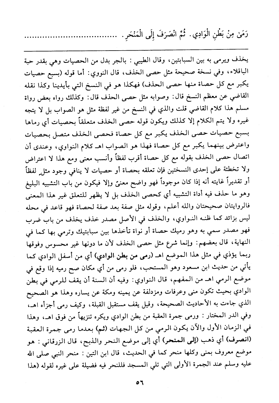 يخذف ويرمى به بين السبابتين، وقال الطيبي: بالجر بدل من الحصيات وهي بقدر حبة الباقلاء، وفي نسخة صحيحة مثل حصى الخذف، قال النووي: أما قوله (بسبع حصيات يكبر مع كل حصاة منها حصى الحذف) فهكذا هو في النسخ التي بأيدينا وكذا نقله القاضي عن معظم النسح قال: وصوابه مثل حصى الحذف قال: وكذلك رواه بعض رواة مسلم هذا كلام القاضي قلت والذي في النسخ من غير لفظة مثل هو الصواب بل لا يتجه غيره ولا يتم الكلام إلَّا كذلك ويكون قوله حصى الخذف متعلقًا بحصيات أي رماها بسبع حصيات حصى الخذف يكبر مع كل حصاة فحصى الخذف متصل بحصيات واعترض بينهما يكبر مع كل حصاة فهذا هو الصواب اهـ كلام النواوي، وعندى أن اتصال حصى الخذف بقوله مع كل حصاة أقرب لفظًا وأنسب معنى ومع هذا لا اعتراض ولا تخطئة على إحدى النسختين فإن تعلقه بحصاة أو حصيات لا ينافي وجود مثلٍ لفظًا أو تقديرًا غايته أنَّه إذا كان موجودًا فهو واضح معنىً وإلا فيكون من باب التشبيه البليغ وهو ما حذف فيه أداة التشبيه أي كحصى الخذف بل لا يظهر للتعلق غير هذا المعنى فالروايتان صحيحتان والله أعلم، وقوله مثل صفة بعد صفة لحصاة فهو قاعد في محله ليس بزائد كما ظنه النواوي، والخذف في الأصل مصدر خذف يخذف من باب ضرب فهو مصدر سمي به وهو رميك حصاة أو نواة تأخذها بين سبابتيك وترمي بها كما في النهاية، قال بعضهم: وإنما شرع مثل حصى الخذف لأن ما دونها غير محسوس وفوقها ربما يؤذي في مثل هذا الموضع اهـ (رمى من بطن الوادي) أي من أسفل الوادي كما يأتي من حديث ابن مسعود وهو المستحب، فلو رمى من أي مكان صح رميه إذا وقع في موضع الرمي اهـ من المفهم، قال النواوي: وفيه أن السنة أن يقف للرمي في بطن الوادي بحيث تكون منى وعرفات ومزدلفة عن يمينه ومكة عن يساره وهذا هو الصحيح الَّذي جاءت به الأحاديث الصحيحة، وقيل يقف مستقبل القبلة، وكيف رمى أجزأه اهـ، وفي الدر المختار: ورمى جمرة العقبة من بطن الوادي ويكره تنزيهًا من فوق اهـ، وهذا في الزمان الأول والآن يكون الرمي من كل الجهات (ثم) بعدما رمى جمرة العقبة (انصرف) أي ذهب (إلى المنحر) أي إلى موضع النحر والذبح، قال الزرقاني: هو موضع معروف بمنى وكلها منحر كما في الحديث، قال ابن التين: منحر النبي صلى الله عليه وسلم عند الجمرة الأولى التي تلي المسجد فللنحر فيه فضيلة على غيره لقوله (هذا