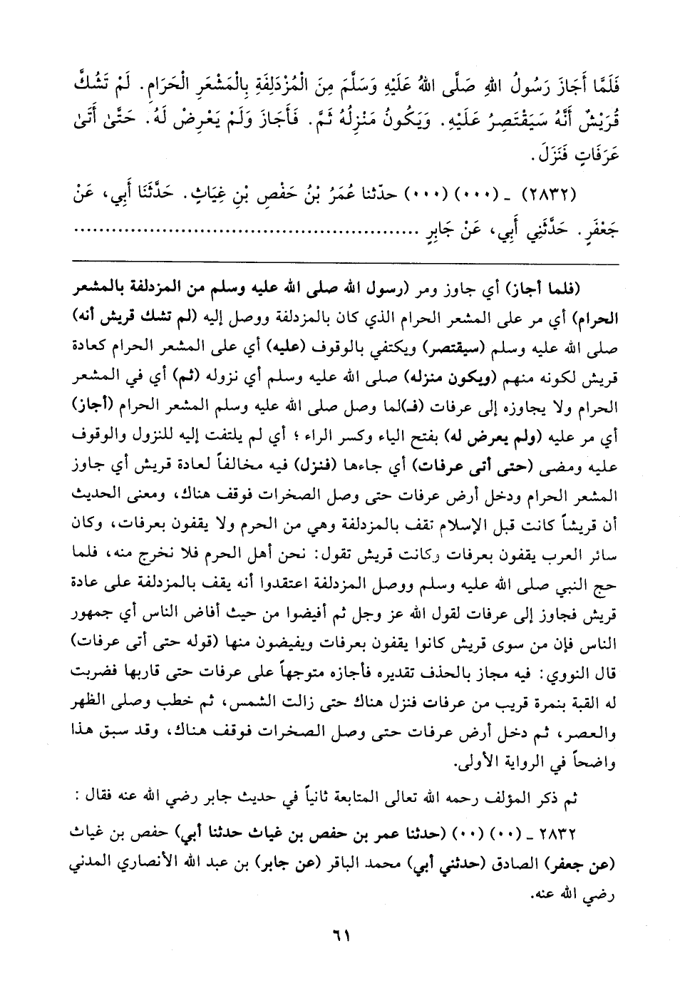 فَلَمَّا أَجَازَ رَسُولُ اللهِ صَلَّى اللهُ عَلَيهِ وَسَلَّمَ مِنَ الْمُزْدَلِفَةِ بِالْمَشْعَرِ الحَرَامِ. لَمْ تَشُكَّ قُرَيشٌ أَنهُ سَيَقْتَصِرُ عَلَيهِ. ويكُونُ مَنْزِلُهُ ثَمَّ. فَأَجَازَ وَلَمْ يَعْرِضْ لَهُ. حَتَّى أَتَى عَرَفَاتٍ فَنَزَلَ.