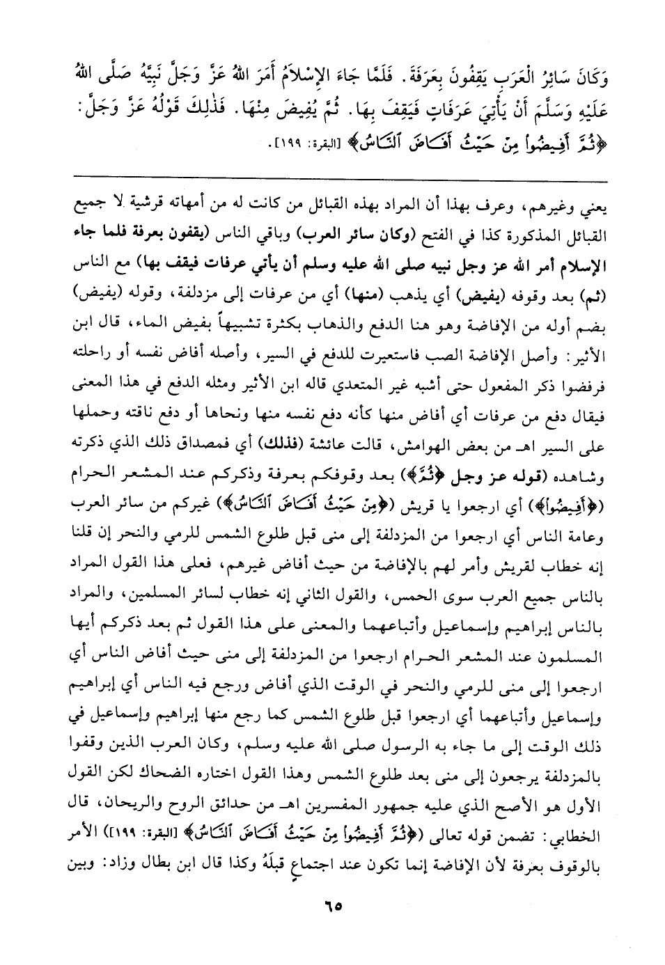 وَكَانَ سَائِرُ الْعَرَبِ يَقِفُونَ بِعَرَفَةَ. فَلَمَّا جَاءَ الإِسْلَامُ أَمَرَ اللهُ عَزَّ وَجَلَّ نَبِيَّهُ صَلَّى اللهُ عَلَيهِ وَسَلَّمَ أَنْ يأتِيَ عَرَفَاتِ فَيَقِفَ بِهَا. ثُمَّ يُفِيضَ مِنْهَا. فَذلِكَ قَوْلُهُ عَزَّ وَجَلَّ: {ثُمَّ أَفِيضُوا مِنْ حَيثُ أَفَاضَ النَّاسُ} [البقرة: ١٩٩]