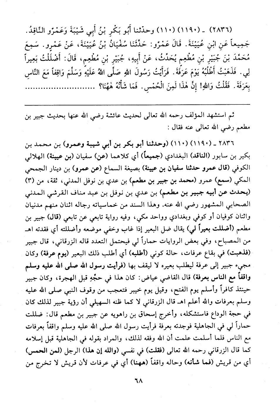 (٢٨٣٦) - (١١٩٠) (١١٠) وحدَّثنا أَبُو بَكْرٍ بْنُ أَبِي شَيبَةَ وَعَمْرٌو النَّاقِدُ. جَمِيعًا عَنِ ابْنِ عُيَينَةَ. قَال عَمْرٌو: حَدَّثَنَا سُفْيَانُ بْنُ عُيَينَةَ، عَنْ عَمْرٍو. سَمِعَ مُحَمَّدَ بْنَ جُبَيرِ بْنِ مُطْعِمٍ يُحدَّثُ، عَنْ أَبِيهِ، جُبَيرِ بْنِ مُطْعِمٍ، قَال: أَضْلَلْتُ بَعِيرًا لِي. فَذَهَبْتُ أَطْلُبُهُ يَوْمَ عَرَفَةَ. فَرَأَيتُ رَسُولَ اللهِ صَلَّى اللهُ عَلَيهِ وَسَلَّمَ وَاقِفًا مَعَ النَّاسِ بِعَرَفَةَ. فَقُلْتُ وَاللهِ! إِنَّ هذَا لَمِنَ الْحُمْسِ. فَمَا شَأنُهُ فهُنَا؟