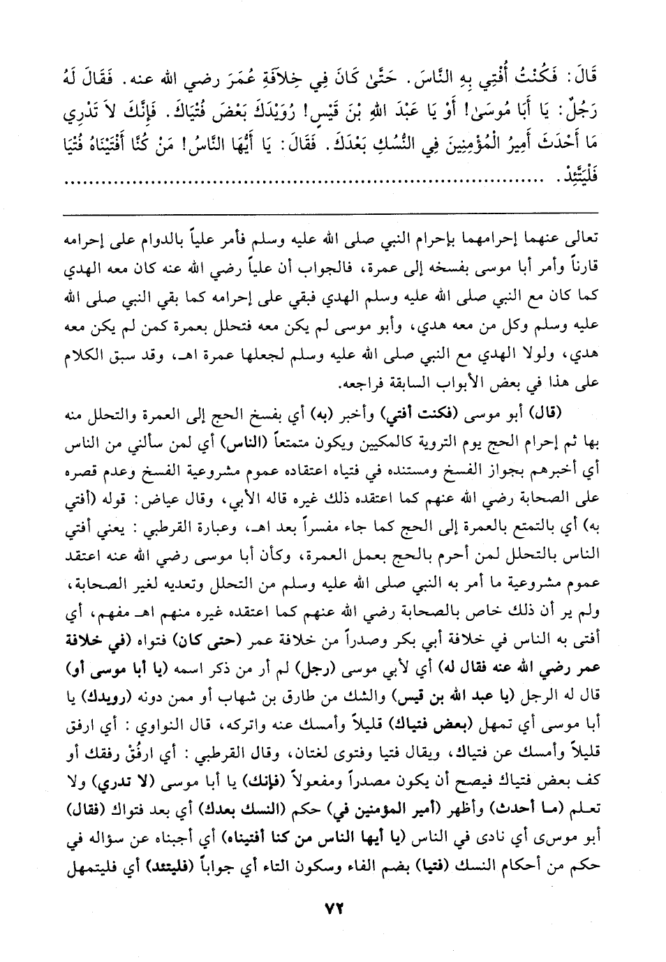 قَال: فَكُنْتُ أُفْتِي بِهِ النَّاسَ. حَتى كَانَ فِي خِلافةِ عُمَرَ رضي الله عنه. فَقَال لَهُ رَجُلٌ: يَا أَبَا مُوسَى! أَوْ يَا عَبْدَ اللهِ بْنَ قَيسٍ! رُوَيدَكَ بَعْضَ فُتْيَاكَ. فَإِنَّكَ لَا تَدْرِي مَا أَحْدَثَ أَمِيرُ الْمُؤْمِنِينَ فِي النُّسُكِ بَعْدَكَ. فَقَال: يَا أَيُّهَا النَّاسُ! مَنْ كُنَّا أَفْتَينَاهُ فُتْيَا فَلْيَتَّئِدْ