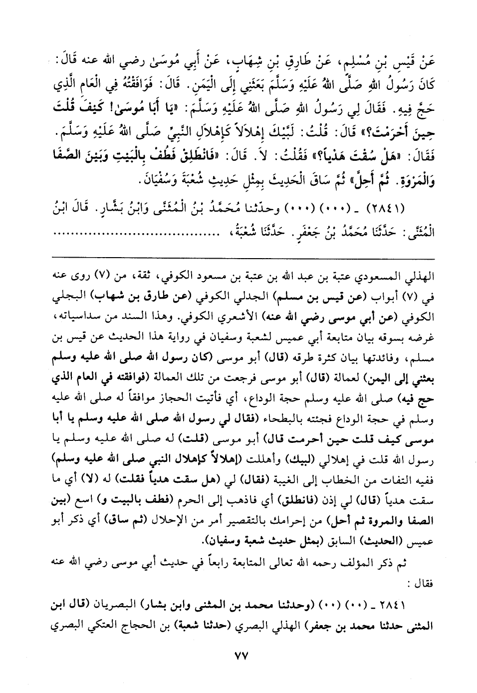 عَنْ قَيسِ بْنِ مُسْلِمٍ، عَنْ طَارِقِ بْنِ شِهَابٍ، عَنْ أَبِي مُوسَى رضي الله عنه قَال: كَانَ رَسُولُ اللهِ صَلَّى اللهُ عَلَيهِ وَسَلَّمَ بَعَثَنِي إِلَى الْيَمَنِ. قَال: فَوَافَقْتُهُ فِي الْعَامِ الَّذِي حَجَّ فِيهِ. فَقَال لِي رَسُولُ اللهِ صَلَّى اللهُ عَلَيهِ وَسَلَّمَ: "يَا أَبَا مُوسَى! كَيفَ قُلْتَ حِينَ أَحْرَمْتَ؟ " قَال: قُلْتُ: لَبَّيكَ إِهْلالًا كَإِهْلالِ النَّبِيِّ صَلَّى اللهُ عَلَيهِ وَسَلَّمَ. فَقَال: "هَلْ سُقْتَ هَدْيًا؟ " لا فَقُلْتُ: لَا. قَال: "فَانْطَلِقْ فَطُفْ بِالْبَيتِ وَبَينَ الصَّفَا وَالْمَرْوَةِ. ثُمَّ أَحِلَّ" ثُمَّ سَاقَ الْحَدِيثَ بِمِثْلِ حَدِيثِ شُعْبَةَ وَسُفْيَانَ.