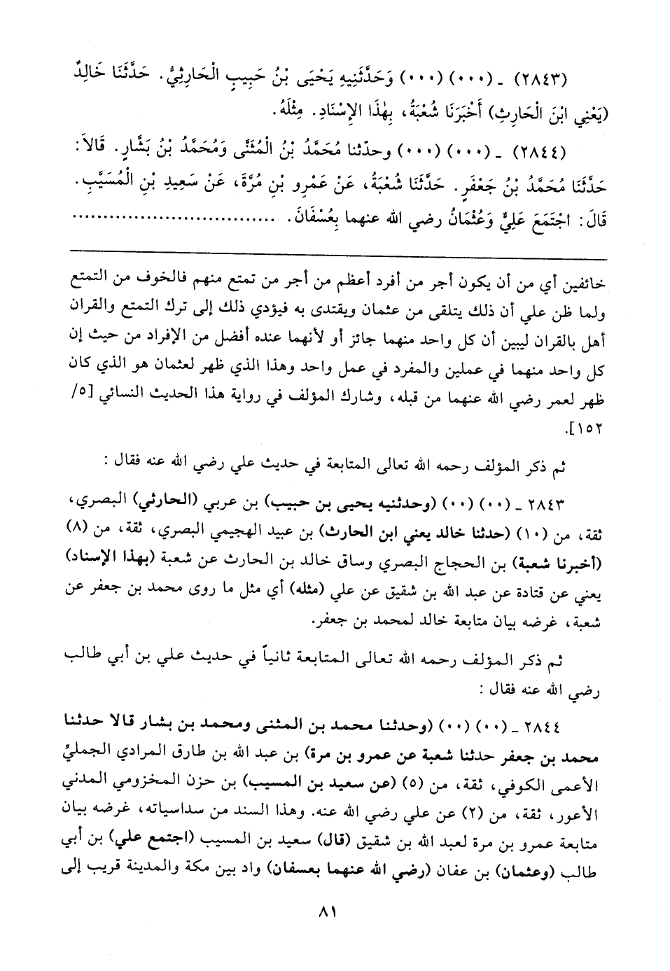 (٢٨٤٤) - (٠٠) (٠٠) وحدّثنا مُحَمَّدُ بْنُ الْمُثَنَّى وَمُحَمَّدُ بْنُ بَشَّارٍ. قَالا: حَدَّثَنَا مُحَمَّدُ بْنُ جَعْفَرٍ. حَدَّثَنَا شُعْبَةُ، عَنْ عَمْرِو بْنِ مُرَّةَ، عَنْ سَعِيدِ بْنِ الْمُسَيَّبِ. قَال: اجْتَمَعَ عَلِيٌّ وَعُثْمَانُ رضي الله عنهما بِعُسْفَانَ