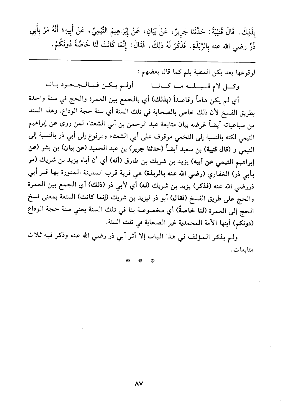 أي لم يكن هامًّا وقاصدًا (بذلك) أي بالجمع بين العمرة والحج في سنة واحدة بطريق الفسخ لأن ذلك خاص بالصحابة في تلك السنة أي سنة حجة الوداع. وهذا السند من سباعياته أيضًا غرضه بيان متابعة عبد الرحمن بن أبي الشعثاء لمن روى عن إبراهيم التيمي لكنه بالنسبة إلى النخعي موقوف على أبي الشعثاء ومرفوع إلى أبي ذر بالنسبة إلى التيمي و (قال قتيبة) بن سعيد أيضًا (حدثنا جرير) بن عبد الحميد (عن بيان) بن بشر (عن إبراهيم التيمي عن أبيه) يزيد بن شريك بن طارق (أنه) أي أن أباه يزيد بن شريك (مر بأبي ذر) الغفاري (رضي الله عنه بالربذة) هي قرية قرب المدينة المنورة بها قبر أبي ذر رضي الله عنه (فذكر) يزيد بن شريك (له) أي لأبي ذر (ذلك) أي الجمع بين العمرة والحج على طريق الفسخ (فقال) أبو ذر ليزيد بن شريك (إنما كانت) المتعة بمعنى فسخ الحج إلى العمرة (لنا خاصةً) أي مخصوصة بنا في تلك السنة يعني سنة حجة الوداع (دونكم) أيتها الأمة المحمدية غير الصحابة في تلك السنة.