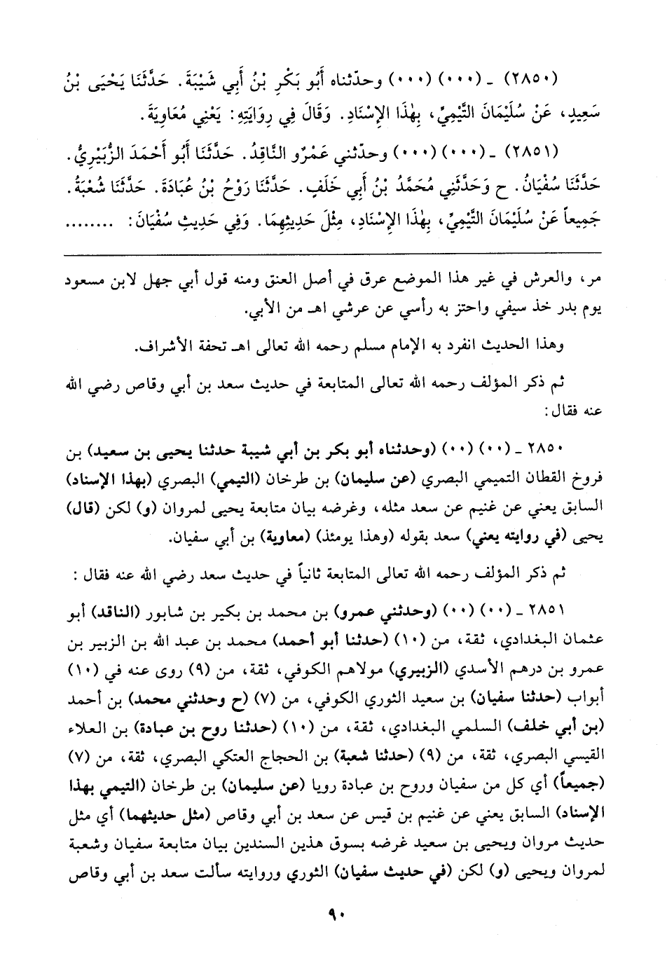 ٢٨٥١ - (٠٠) (٠٠) (وحدثني عمرو) بن محمد بن بكير بن شابور (الناقد) أبو عثمان البغدادي، ثقة، من (١٠) (حدثنا أبو أحمد) محمد بن عبد الله بن الزبير بن عمرو بن درهم الأسدي (الزبيري) مولاهم الكوفي، ثقة، من (٩) روى عنه في (١٠) أيواب (حدثنا سفيان) بن سعيد الثوري الكوفي، من (٧) (ح وحدثني محمد) بن أحمد (بن أبي خلف) السلمي البغدادي، ثقة، من (١٠) (حدثنا روح بن عبادة) بن العلاء القيسي البصري، ثقة، من (٩) (حدثنا شعبة) بن الحجاج العتكي البصري، ثقة، من (٧) (جميعًا) أي كل من سفيان وروح بن عبادة رويا (عن سليمان) بن طرخان (التيمي بهذا الإسناد) السابق يعني عن غنيم بن قيس عن سعد بن أبي وقاص (مثل حديثهما) أي مثل حديث مروان ويحيى بن سعيد غرضه بسوق هذين السندين بيان متابعة سفيان وشعبة لمروان ويحيى (و) لكن (في حديث سفيان) الثوري وروايته سألت سعد بن أبي وقاص
