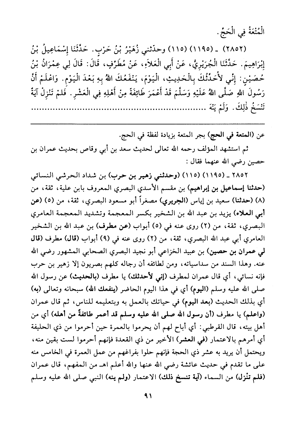 (٢٨٥٢) - (١١٩٥) (١١٥) وحدّثني زُهَيرُ بْنُ حَرْبٍ. حَدَّثَنَا إِسْمَاعِيلُ بْنُ إِبْرَاهِيمَ. حَدَّثَنَا الْجُرَيرِيُّ، عَنْ أَبِي الْعَلاءِ، عَنْ مُطَرِّفٍ، قَال: قَال لِي عِمْرَانُ بْنُ حُصَينٍ: إِنِّي لأُحَدِّثُكَ بِالْحَدِيثِ، الْيَوْمَ، يَنْفَعُكَ اللهُ بِهِ بَعْدَ الْيَوْمِ. وَاعْلَمْ أَنَّ رَسُولَ اللهِ صَلَّى اللهُ عَلَيهِ وَسَلَّمَ قَدْ أَعْمَرَ طَائِفَةً مِن أَهْلِهِ فِي الْعَشْرِ. فَلمْ تَنْزِلْ آيَةٌ تَنْسَخُ ذلِكَ. وَلَمْ يَنْهَ