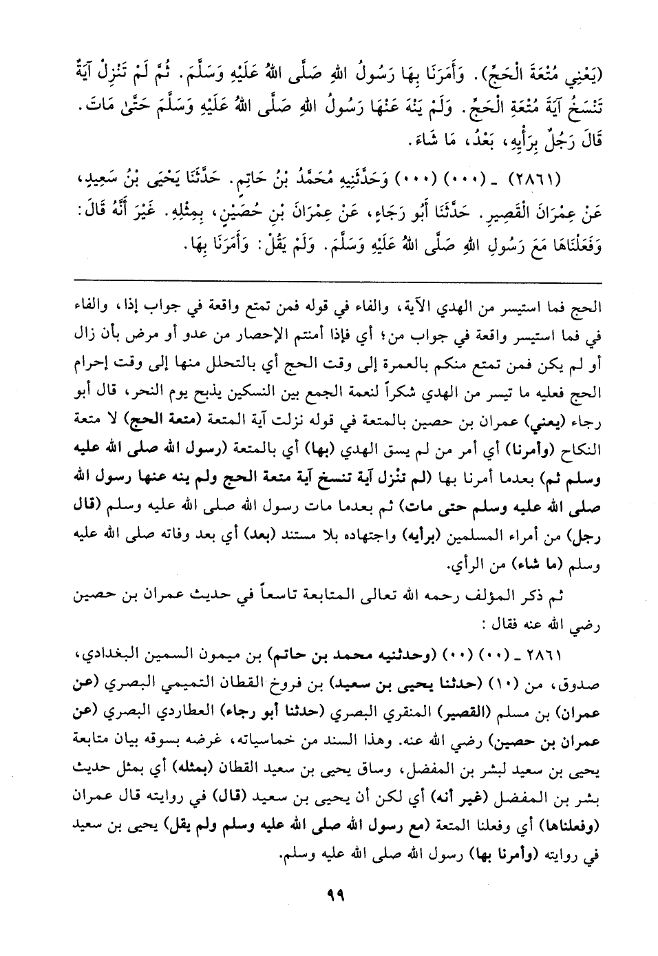 ٢٨٦١ - (٠٠) (٠٠) (وحدثنيه محمد بن حاتم) بن ميمون السمين البغدادي، صدوق، من (١٠) (حدثنا يحيى بن سعيد) بن فروخ القطان التميمي البصري (عن عمران) بن مسلم (القصير) المنقري البصري (حدثنا أبو رجاء) العطاردي البصري (عن عمران بن حصين) رضي الله عنه. وهذا السند من خماسياته، غرضه بسوقه بيان متابعة يحيى بن سعيد لبشر بن المفضل، وساق يحيى بن سعيد القطان (بمثله) أي بمثل حديث بشر بن المفضل (غير أنه) أي لكن أن يحيى بن سعيد (قال) في روايته قال عمران (وفعلناها) أي وفعلنا المتعة (مع رسول الله صلى الله عليه وسلم ولم يقل) يحيى بن سعيد في روايته (وأمرنا بها) رسول الله صلى الله عليه وسلم.
