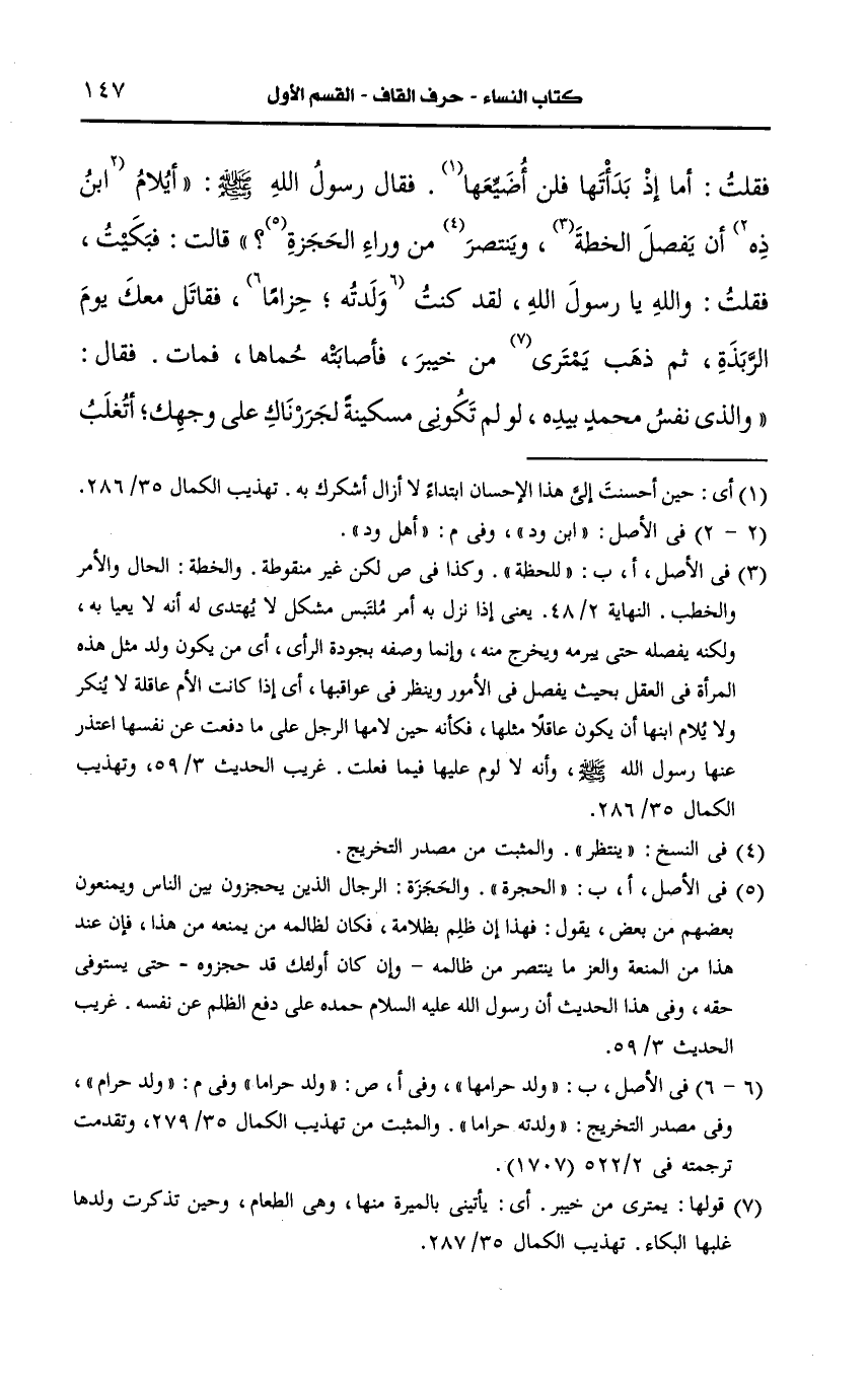 فقلت أما إذ بدأتها فلن أضيعها فقال رسول الله صَلى الله عَلَيه وسَلم أيلام أهل ود أن يفصل الخطة أو ينتظر من وراء الحجزة قالت فبكيت فقلت والله يا رسول الله لقد كنت ولد حرام فقاتل معك يوم الربذة ثم ذهب يمتري من خيبر فأصابته حماها فمات فقال والذي نفسي بيده لو لم تكوني مسكينة لجررناك على وجهك أتغلب إحداهن أن تصاحب صويحبة في الدنيا معروفا