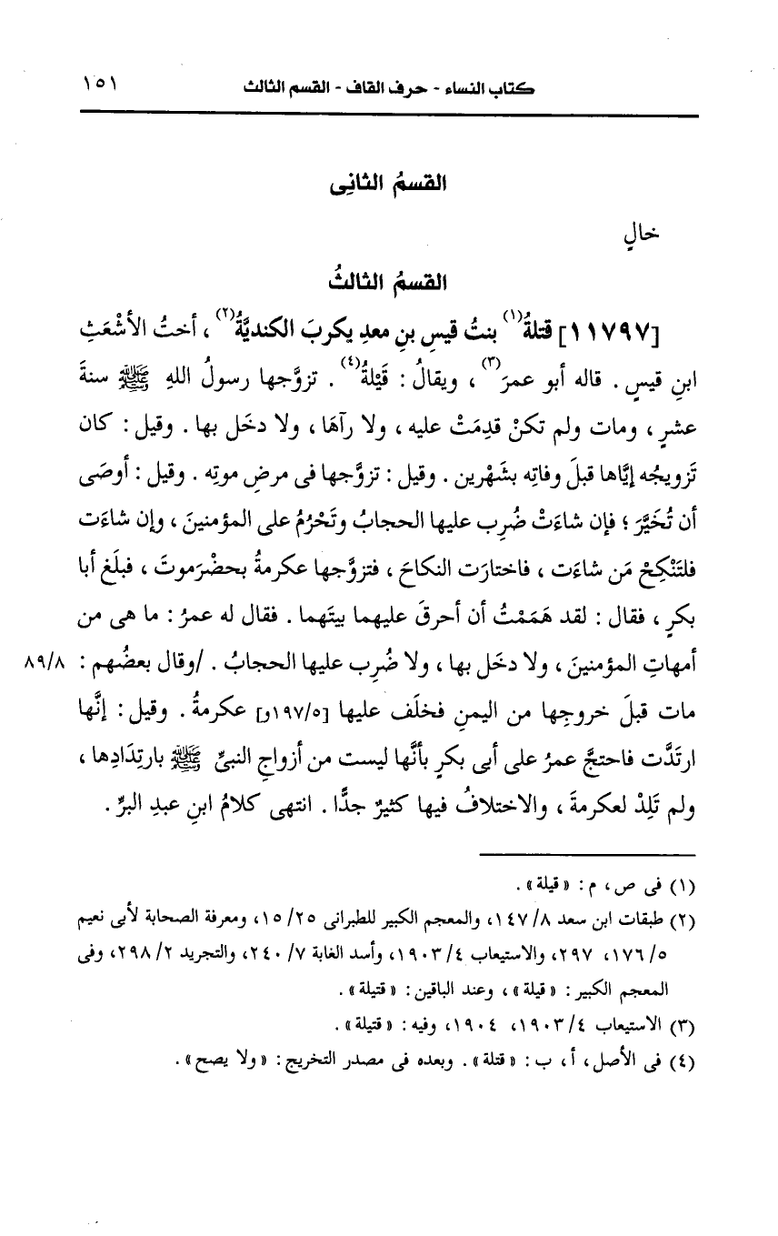 قاله أَبو عمر، ويُقال: قيلة تزوجها رسول الله صَلى الله عَلَيه وسَلم سنة عشر ومات ولم تك قدمت عليه ولا رآها ولا دخل بها وقيل كان تزويجه إياها قبل وفاته بشهرين وقيل تزوجها في مرض موته وقيل أوصى أن تخبر فإن شاءت ضربه عليها الحجاب وتحرم على المؤمنين وإن شاءت فلتنكح من شاءت فاختارت النكاح فتزوجتها عكرمة بحضرموت فبلغ أبا بكر فقال لقد هممت أن أحرق عليهما بيتهما فقال له عمر ما هي من أمهات المؤمنين ولا دخل بها ولا ضرب عليها الحجاب.