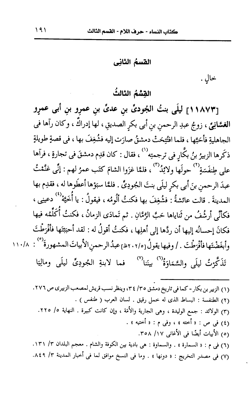 لها إدراك، وكان رآها في الجاهلية فأحبها فلما افتتحت دمشق صارت إليه فشغف بها في قصة طويلة ذكرها الزبير بن بكار في ترجمته فقال كان قدم دمشق في تجارة فرآها على طنفسة حولها ولائد فلما غزوا الشام كتب عمر لهم أني غنمت عبد الرحمن بن أبي بكر ليلى بنت الجودي فلما سبوها أعطوها له فقدم بها المدينة فقالت عائشة فشغف بها فكنت ألومه فيقول يا أختيه دعيني فكأني أرشف من ثناياها حب الرمان ثم تمادى الزمان فكنت أكلمه فيها فكان إحسانه إليها أن ردها إلى أهلها فكنت أقول له لقد أحببتها فأفرطت وأبغضتها فأفرطت.