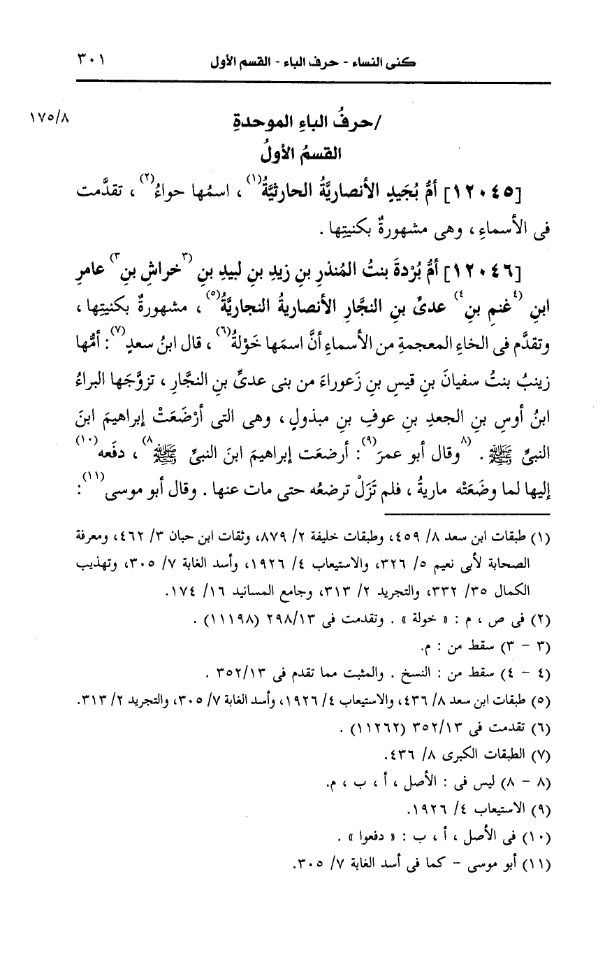 12046- أم بردة بنت المنذر بن زيد بن لبيد بن عامر بن عَدِيّ بن النجار، الأَنصارِيّة النجارية. مشهورة بكنيتها وتقدم في الخاء المعجمة من الأسماء أن اسمها خولة.