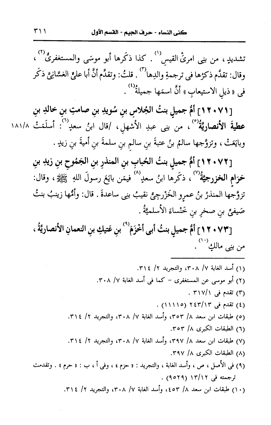 12072- أم جميل بنت الحباب بن المنذر بن الجموح بن زيد بن حرام الخزرجية.