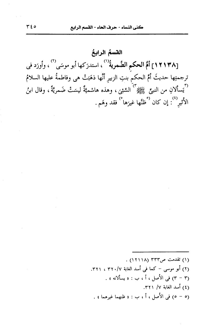 استدركها أَبو موسى وأورد في ترجمتها حديث أم الحكم بنت الزبير أنها ذهبت هي وفاطمة عليها السلام يسألان من النَّبيّ صَلى الله عَلَيه وسَلم السبي وهذه هاشمية ليست ضمرية.