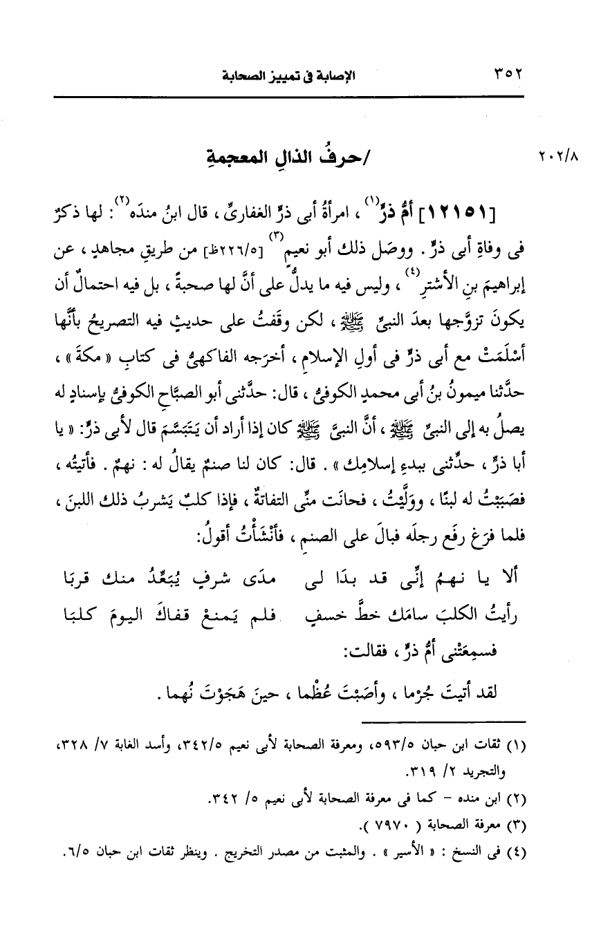 قال ابن مَنْدَه: لها ذكر في وفاة أبي ذر ووصل ذلك أَبو نعيم من طريق مجاهد، عَن إبراهيم بن الأسير وليس فيه ما يدل على أن له صُحبَةٌ بل فيه احتمال أن يكون تزوجها بعد النَّبيّ صَلى الله عَلَيه وسَلم لكن وقفت على حديث فيه التصريح بأنها أسلمت مع أبي ذر في أول الإسلام أَخرجه الفاكهي في كتاب مكة، حَدَّثنا ميمون بن أبي محمد الكوفي قال حدثني أَبو الصباح الكوفي بإسناد له يصل به إِلَى النَّبِيِّ صَلى الله عَلَيه وسَلم كان إذا أراد أن يتبسم قال لأبي ذر يا أبا ذر حدثني بيدء إسلامك، قال: كان لنا صنم يُقَالُ لَهُ: نهم فأتيته فصببت له لبنا ووليت فحانت مني التفاتة فإذا كلب يشرب ذلك اللبن فلما فرغ رفع رجله فبال على الصنم فأنشأت أقول: