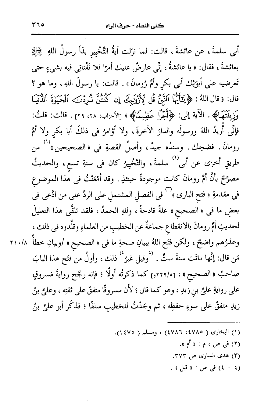 قالت يا رسول وما هو قال قال الله عز وجل ?يا أيها النَّبيّ قل لأزواجك إن كنتن تردن الحياة الدنيا وزينتها...? الآية إلى ?أجرا عظيما? قالت قلت: فإني أريد الله ورسوله والدار الآخرة ولا أؤامر في ذلك أبا بكر ولا أم رومان فضحك وسنده جيد وأصل القصة في الصحيحين من طريق أخرى، عَن أُم سَلَمة والتخيير كان في سنة تسع والحديث مصرح بأن أم رومان كانت موجودة حينئذ وقد أمعنت في هذا الموضوع في مقدمة فتح السابري في الفصل المشتمل على الرد على من ادعى في بعض ما في الصحيح علة قادحة ولله الحمد فلقد تلقى هذا التعليل لحديث أم رومان بالانقطاع جماعة، عَن الخطيب من العلماء وقلدوه في ذلك وعدرهم واضح ولكن فتح الله ببيان صحة ما في الصحيح وبيان خطأ من قال أنها ماتت سنة ست وقيل غير ذلك وأول من فتح هذا الباب صاحب الصحيح كما ذكره أولا فإنه رجح رواية مسروق على رواية علي بن زيد وهو كَما قَال لأن مسروقا متفق على ثقته وعلي بن زيد متفق على سوء حفظه ثم وجدت للخطيب سلفا فذكر أَبو علي بن السَّكَن في كتاب الصحابة في ترجمة أم رومان أنها ماتت في حياة النَّبيّ صَلى الله عَلَيه وسَلم قال وروى حصين، عَن أبي وائل، عَن مسروق قال سألت أم رومان قال ابن السَّكَن: هذا خطأ ثم ساق بسنده إلى حصين، عَن أبي وائل، عَن مسروق أن أم رومان حدثتهم فذكر قصة الإفك التي أوردها البُخارِيّ ثم قال تَفَرَّدَ به حصين، ويُقال: إن مسروقا لم يسمع من أم رومان لأنها ماتت في حياة النَّبيّ صَلى الله عَلَيه وسَلم وبالله التوفيق.