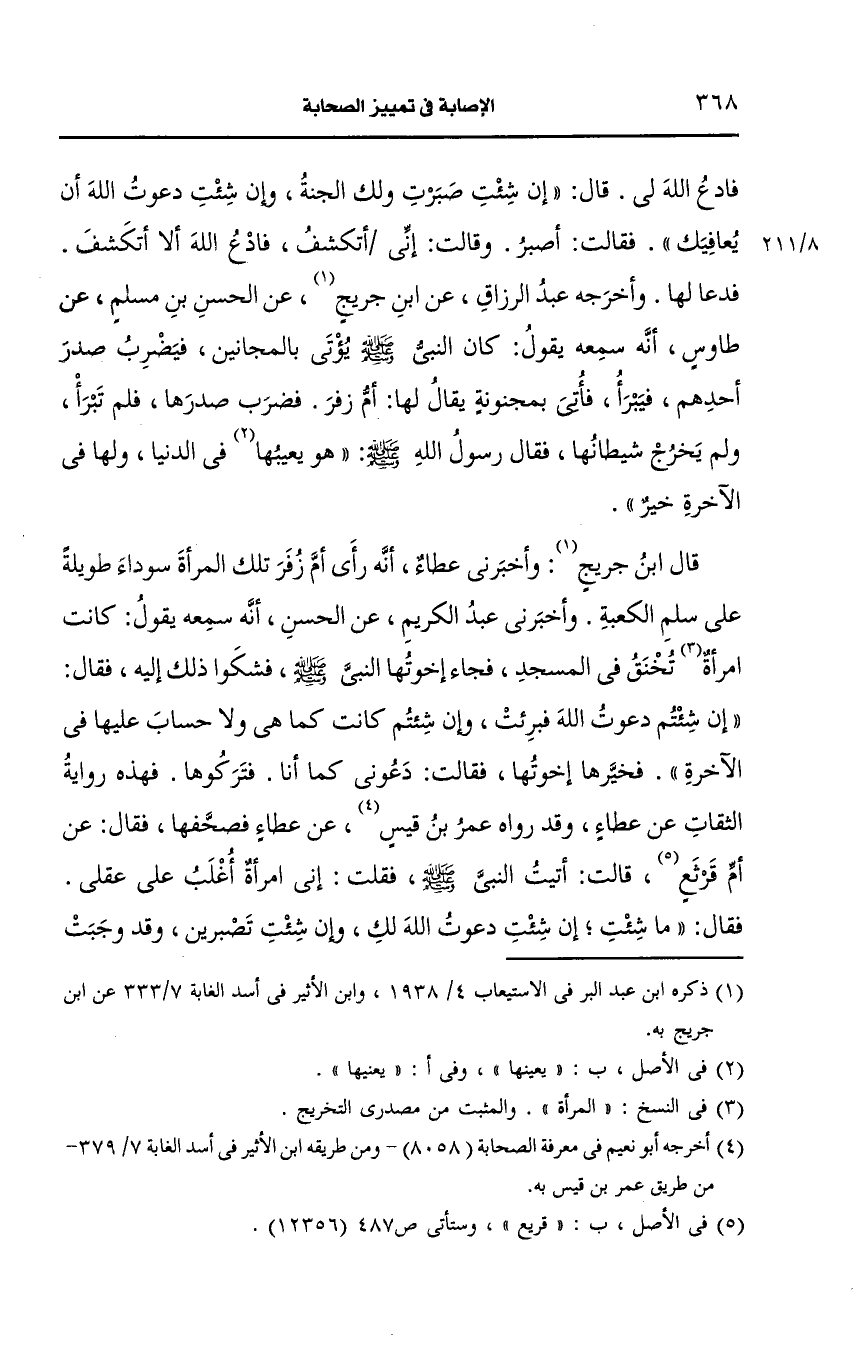 قال ابن جريج وأخبرني عطاء أنه رأى أم زفر تلك المرأة سوداء طويلة على سلم الكعبة وأخبرني عبد الكريم، عَن حسن أنه سمعه يقول كانت المرأة تخنق في المسجد فجاء إخوتها النَّبيّ صَلى الله عَلَيه وسَلم فشكوا ذلك إليه فقال إن شئتم دعوت الله فبرأت وإن شئتم كانت كما هي ولا حساب عليها في الآخرة فخيرها إخوتها فقالت دعوني كما أنا فتركوها فهذه رواية الثقات، عَن عطاء.