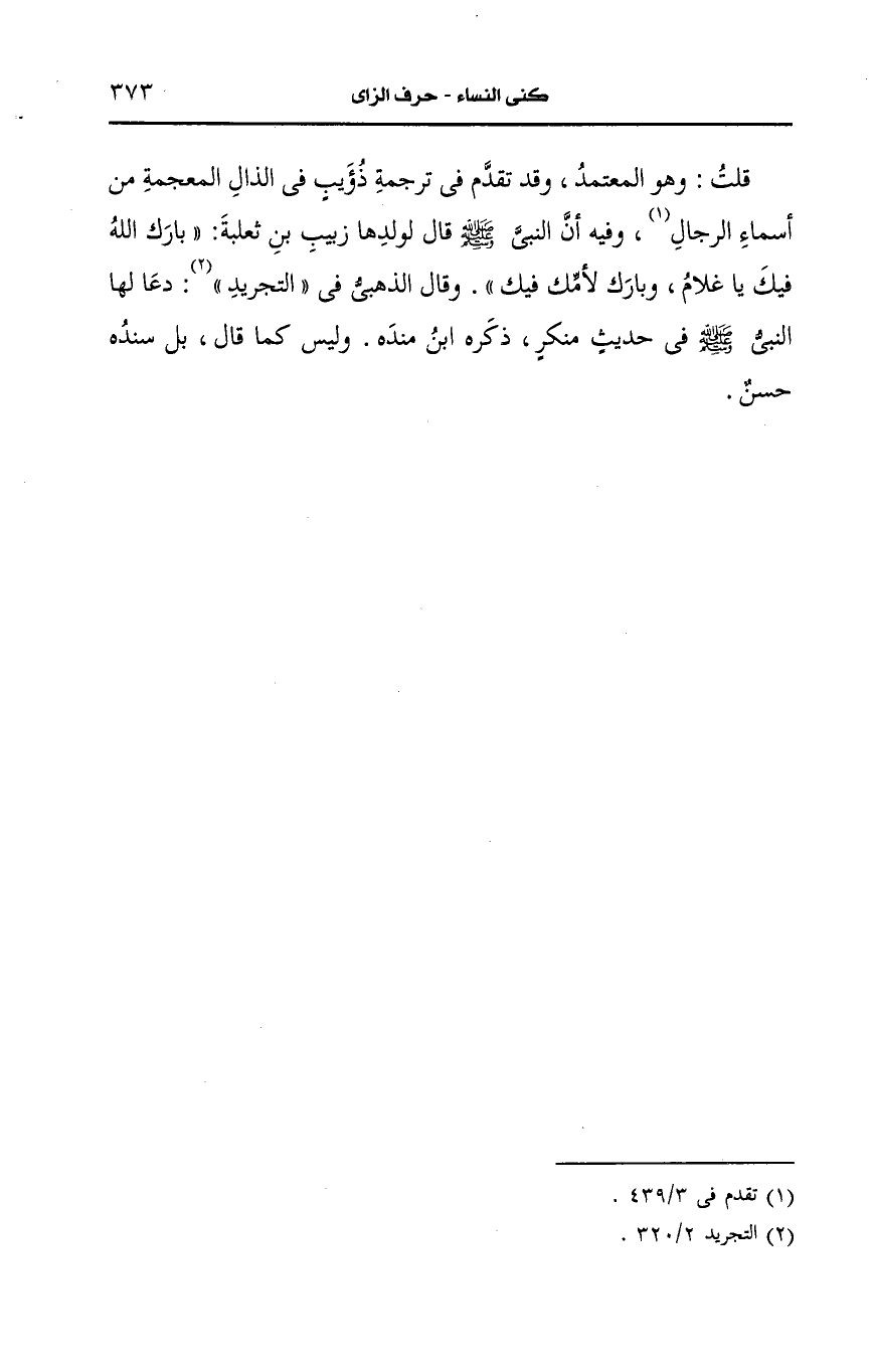 وَقد تَقدَّم في في ترجمة ذؤيب في الذال المعجمة من أسماء الرجال وفيه أَنَّ النَّبِيَّ صَلى الله عَلَيه وسَلم قال لولدها زينب بن ثعلبة بارك الله فيك يا غلام وبارك لأمك فيك".