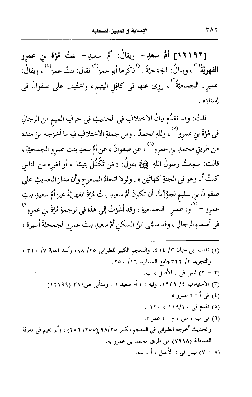 ومن جملة الاختلاف فيه ما أَخرجه ابن مَنْدَه من طريق محمد بن عمر، عَن صفوان، عَن أُم سعد بنت عَمرو الجمحية قالت سمعت رسول الله صَلى الله عَلَيه وسَلم يقول من تكفل يتيما له أو لغيره من الناس كنت أنا وهو في الجنة كهاتين ولولا اتحاد المخرج وأن مدار الحديث على صفوان بن سليم لجوزت أن تكون أم سعيد بنت مرة الفهرية غير أم سعيد بنت عَمرو أو عمير الجمحية وقد أشرت إلى هذا في ترجمة مرة بن عَمرو في أسماء الرجال.