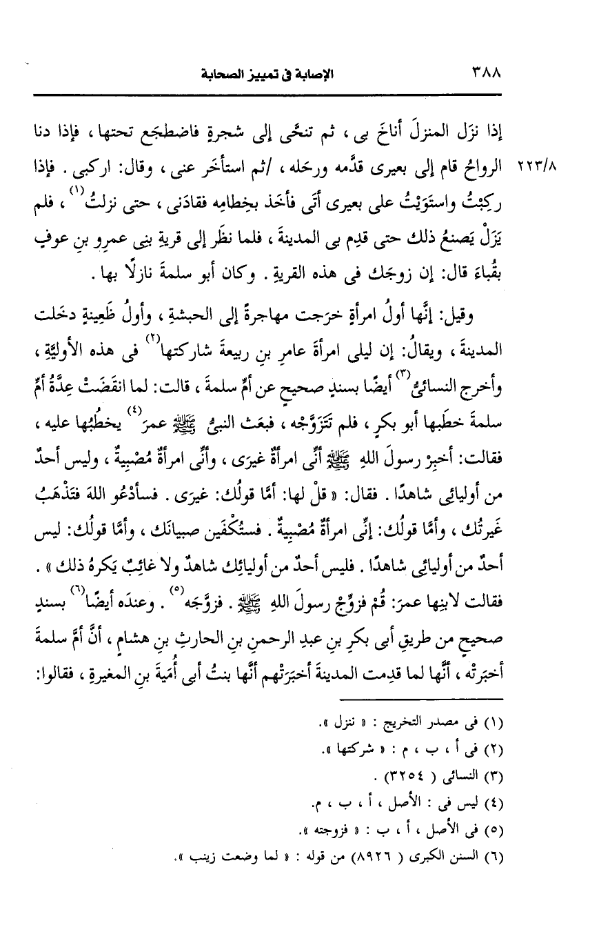 وعنده أيضًا بسند صحيح من طريق أبي بكر بن عبد الرحمن بن الحارث بن هشام - أن أُم سَلَمة أخبرته أنها لما قدمت المدينة أخبرتهم أنها بنت أَبي أُمَيَّة بن المغيرة فقالوا ما أكذب الغرائب حتى أنشأ أناس منهم الحج, فقالوا أتكتبين إلى أهلك فكتبت معهم فرجعوا يصدقونها وازدادت عليهم كرامة, فلما وضعت زينب جاءني رسول الله صَلى الله عَلَيه وسَلم فخطبني فقالت ما مثلي ينكح أما أنا فلا يولد لي وأنا غيور ذات عيال فقال أنا أكبر منك وأما الغيرة فيذهبها الله وأما العيال فإلى الله ورسوله فتزوجها فجعل يأتيها فيقول أين زناب حتى جاء عمار بن ياسر فاصلحها وكانت ترضعها فقال هذه تمنع رسول الله حاجته فجاء النَّبيّ صَلى الله عَلَيه وسَلم فقال أين زناب وقالت قريبة بنت أَبي أُمَيَّة فوافقتها عندها أخذها عمار بن ياسر فقال أني آتيكم الليلة الحديث.