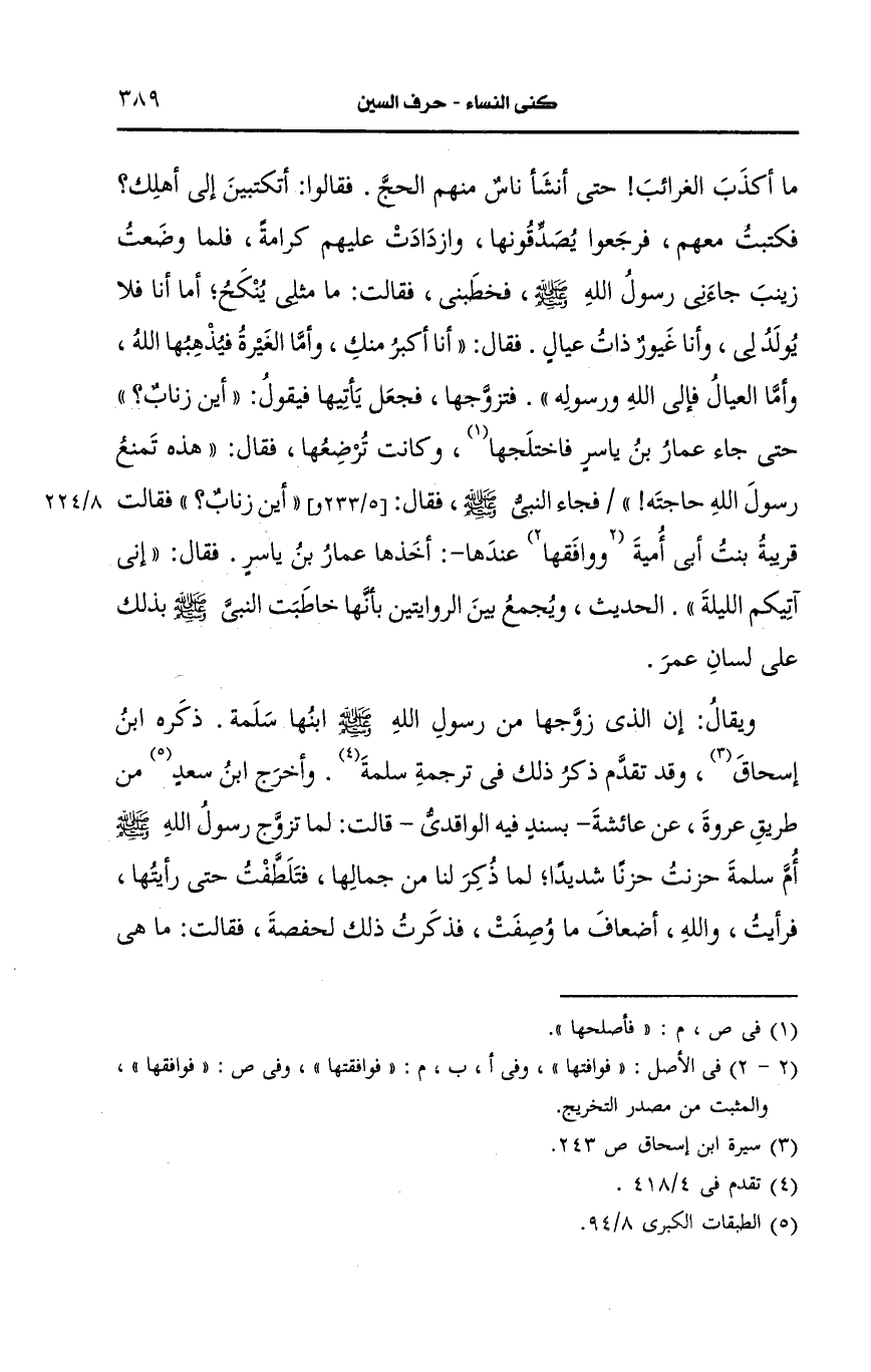 وأخرج ابن سعد من طريق عُروَة، عَن عائشة بسند فيه الواقدي قالت لما تزوج رسول الله صَلى الله عَلَيه وسَلم أُم سَلَمة حزنت حزنا شديدا لما ذكر لنا من جمالها فتلطفت حتى رأيتها فرأيت والله أضعاف ما وصفت فذكرت ذلك لحفصة فقالت ما هي كما يقال, فتلطفت لها حفصة حتى رأتها فقالت قد رأيتها ولا والله ما هي كما تقولين ولا قريب وأنها جميلة قالت فرأيتها بعد ذلك فكانت كَما قَالت حفصة ولكني كنت غيرى.