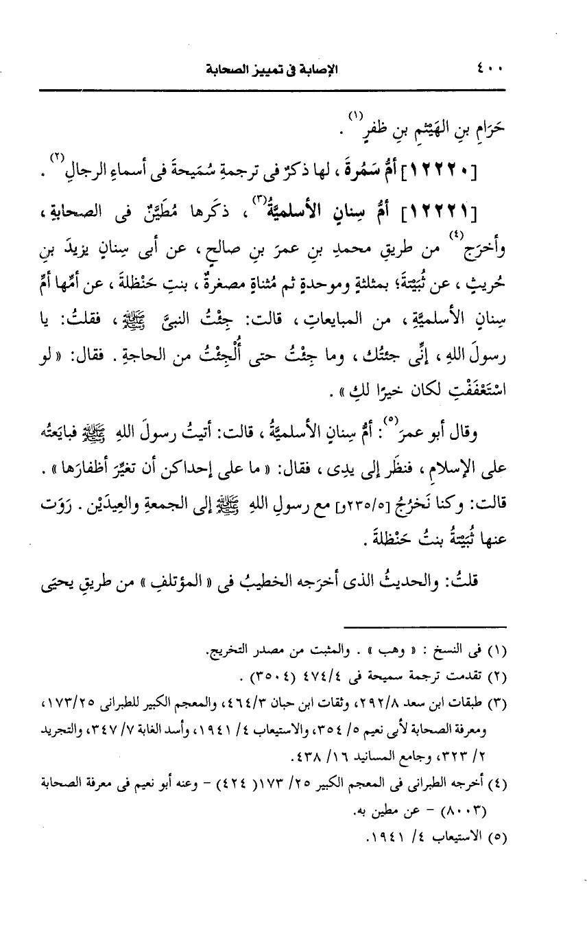 قلت: والحديث الذي أَخرجه الخطيب في المؤتلف من طريق يحيى بن العلاء القاضي، عَن صالح بن حريث بن يزيد، عَن سمعت ثبيتة به, أَخرجه ابن سَعد، عَن الواقدي، عَن عمر بن صالح الحوطي، عَن حريث بن يزيد الأسلمي، عَن ثبيتة بنت حنظلة، عَن أمها أم سنان وأخرج أيضًا في ترجمة صفية بنت حيي من طريق ثبيتة بنت حنظلة، عَن أمها، عَن أُم سنان الأسلمية قالت كنت فيمن حضر عرس صفية فمشطناها وعطرناها وكانت من أضوء ما يكون من النساء فأعرس بها رسول الله صَلى الله عَلَيه وسَلم فسألناها فذكرت أنه سر بها ولم ينم تلك الليلة لم يزل يتحدث معها وأصبح فأو لم عليها.