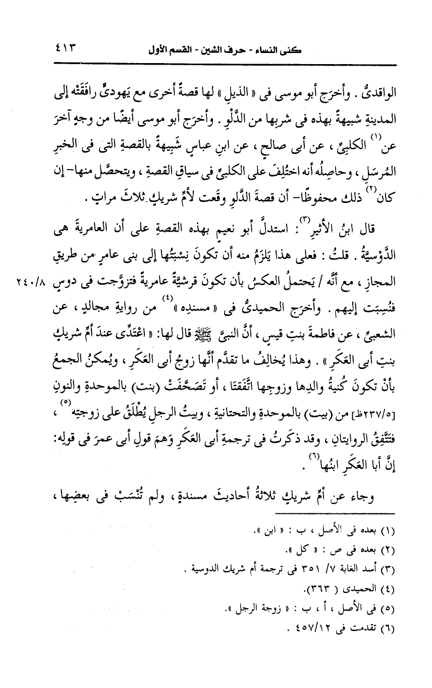 وأخرج أَبو موسى أيضًا من وجه آخر، عَن الكلبي، عَن أبي صالح، عَن ابن عباس شبيهة بالقصة التي في الخبر المرسل وحاصله أنه اختلف على الكلبي في سياق القصة ويتحصل منها إن كان ذلك محفوظا أن قصة الدلو وقعت لأم شريك ثلاث مرات قال ابن الأثير استدل أَبو نعيم بهذه القصة على أن العامرية هي الدوسية.