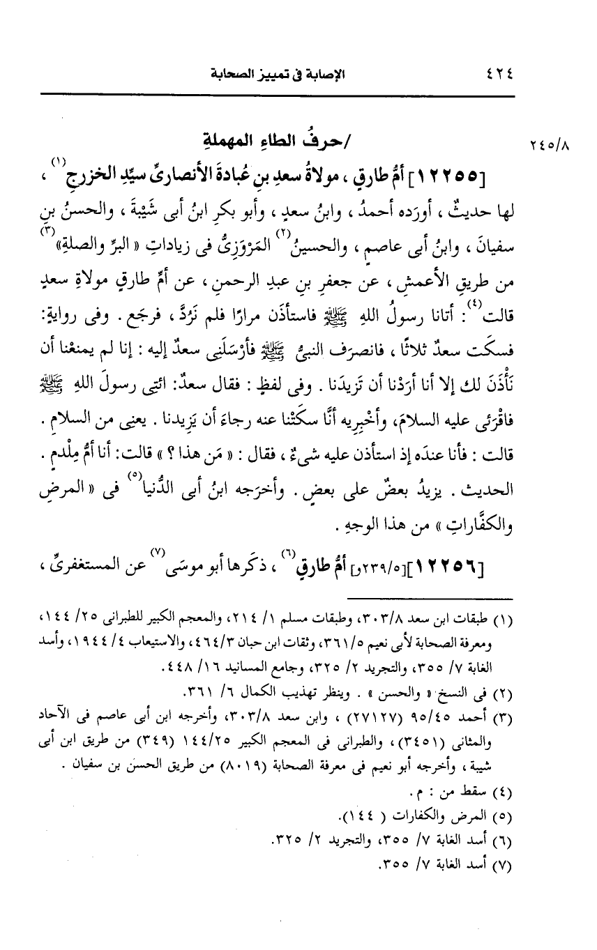 12255- أم طارق مولاة سعد بن عبادة، الأَنصارِيّ سيد الخزرج.
