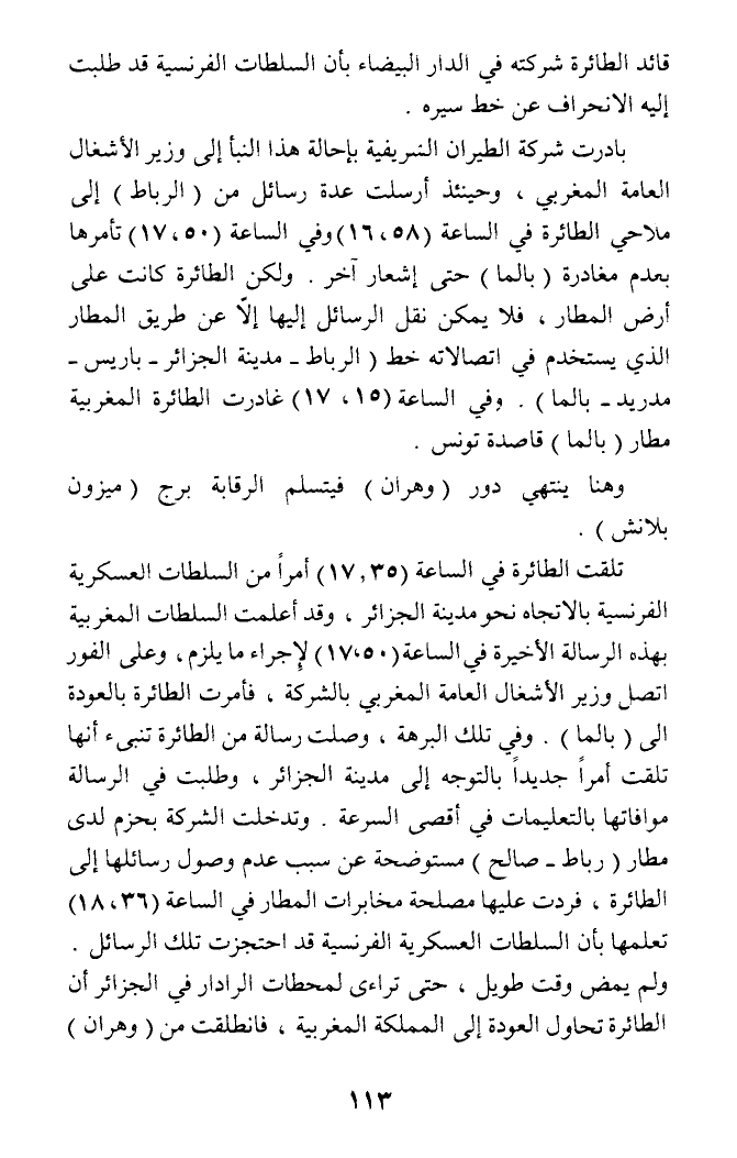 تلقت الطائرة في الساعة (17,35) أمرا من السلطات العسكرية الفرنسية بالاتجاه نحو مدينة الجزائر، وقد أعلمت السلطات المغربية بهذه الرسالة الأخيرة في الساعة (17،50) لإجراء ما يلزم، وعلى الفور اتصل وزير الأشغال العامة المغربي بالشركة، فأمرت الطائرة بالعودة الى (بالما). وفي تلك البرهة، وصلت رسالة من الطائرة تنبىء أنها تلقت أمرا جديدا بالتوجه إلى مدينة الجزائر، وطلبت في الرسالة موافاتها بالتعليمات في أقصى السرعة وتدخلت الشركة بحزم لدى مطار (رباط - صالح) مستوضحة عن سبب عدم وصول رسائلها إلى الطائرة، فردت عليها مصلحة مخابرات المطار في الساعة (18،36) تعلمها بأن السلطات العسكرية الفرنسية قد احتجزت تلك الرسائل. ولم يمض وقت طويل، حتى تراءى لمحطات الرادار في الجزائر أن الطائرة تحاول العودة إلى المملكة المغربية، فانطلقت من (وهران)