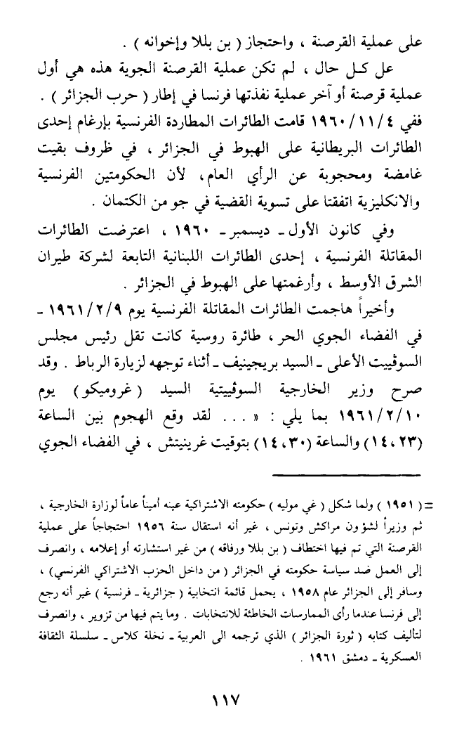 على كل حال، لم تكن عملية القرصنة الجوية هذه هي أول عملية قرصنة أو آخر عملية نفذتها فرنسا في إطار (حرب الجزائر). ففي 4/ 11/ 1960 قامت الطائرات المطاردة الفرنسية بإرغام إحدى الطائرات البريطانية على الهبوط في الجزائر، في ظروف بقيت غامضة ومحجوبة عن الرأي العام، لأن الحكومتين الفرنسية والانكليزية اتفقتا على تسوية القضية في جو من الكتمان.