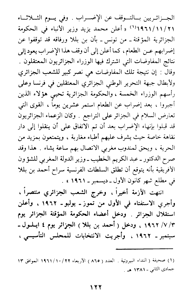 الجزائريين بالتوقف عن الإضراب. وفي يوم الثلاثاء 21/ 11/ 1961 (¬1) (أعلن محمد يزيد وزير الأنباء في الحكومة الجزائرية المؤقتة - من تونس - بأن بن بللا ورفاقه قد توقفوا عن إضرابهم عن الطعام، كما أعلن إلى أن وقف هذا الإضراب يعود إلى نتائج المفاوضات التي اشترك فيها الوزراء الجزائريون المعتقلون. وقال إن نتيجة تلك المفاوضات هي نصر كبير للشعب الجزائري ولأبطال جبهة التحرير الوطني الجزائري المعتقلين في فرنسا وعلى رأسهم الوزراء الخمسة، والحكومة الجزائرية تحيي هؤلاء الذين أجبروا، بعد إضراب عن الطعام استمر عشرين يوما، القوى التي تعارض السلام في الجزائر على التراجع. وكان الزعماء الجزائريون قد قبلوا بإنهاء الإضراب بعد أن تم الاتفاق على أن ينقلوا إلى دار نقاهة خاصة حيث يشرف عليهم أطباء مغاربة، ويتمتعون بمزيد من الحرية، ويحق لمندوب مغربي الاتصال بهم ساعة يشاء. هذا وقد صرح الدكتور - عبد الكريم الخطيب - وزير الدولة المغربي للشؤون الأفريقية بأنه يتوقع أن تطلق السلطات الفرنسية صراح أحمد بن بللا في مطلع - شهر كانون الأول - ديسمبر - 1961).