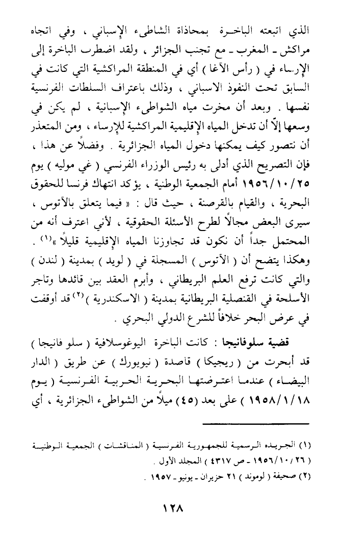 الذي اتبعته الباخرة بمحاذاة الشاطىء الإسباني، وفي اتجاه مراكش - المغرب - مع تجنب الجزائر، ولقد اضطرت الباخرة إلى الإرساء في (رأس الآغا) أي في المنطقة المراكشية التي كانت في السابق تحت النفوذ الاسباني، وذلك باعتراف السلطات الفرنسية نفسها. وبعد أن مخرت مياه الشواطىء الإسبانية، لم يكن في وسعها إلا أن تدخل المياه الإقليمية المراكشية للإرساء، ومن المتعذر أن نتصور كيف يمكنها دخول المياه الجزائرية. وفضلا عن هذا، فإن التصريح الذي أدلى به رئيس الوزراء الفرنسي (غي موليه) يوم 25/ 10/ 1956 أمام الجمعية الوطنية، يؤكد انتهاك فرنسا للحقوق البحرية، والقيام بالقرصنة، حيث قال: (فيما يتعلق بالآتوس، سيرى البعض مجالا لطرح الأسئلة الحقوقية، لأني اعترف أنه من المحتمل جدا أن نكون قد تجاوزنا المياه الإقليمية قليلا) (¬1). وهكذا يتضح أن (الآتوس) المسجلة في (لويد) بمدينة (لندن) والتي كانت ترفع العلم البريطاني، وأبرم العقد بين قائدها وتاجر الأسلحة في القنصلية البريطانية بمدينة (الاسكندرية) (¬2) قد أوقفت في عرض البحر خلافا للشرع الدولي البحري.