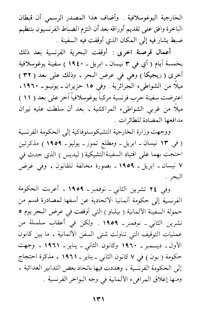 الخارجية اليوغوسلافية. وأضاف هذا المصدر الرسمي أن قبطان الباخرة وافق على تقديم أوراقه بعد أن التزم الضباط الفرنسيون بتنظيم ضبط يشار فيه إلى المكان الذي أوقفت فيه السفينة.
