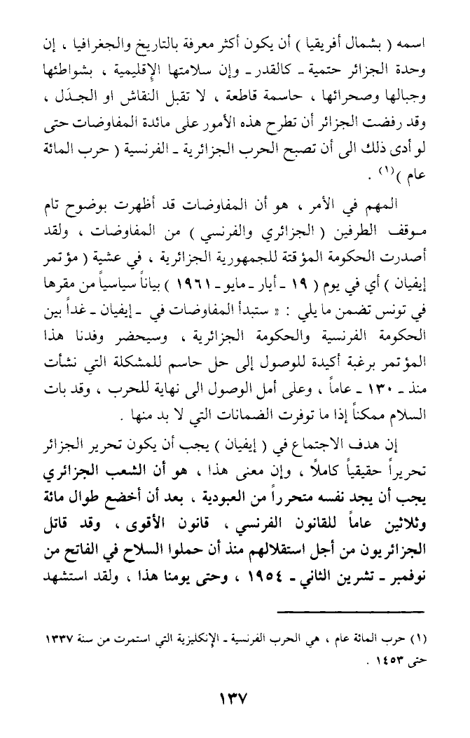 اسمه (بشمال أفريقيا) أن يكون أكثر معرفة بالتاريخ والجغرافيا، إن وحدة الجزائر حتمية - كالقدر - وإن سلامتها الإقليمية، بشواطئها وجبالها وصحرائها، حاسمة قاطعة، لا تقبل النقاش أو الجدل، وقد رفضت الجزائر أن تطرح هذه الأمور على مائدة المفاوضات حتى لو أدى ذلك الى أن تصبح الحرب الجزائرية - الفرنسية (حرب المائة عام) (¬1).