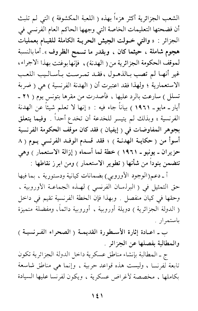 أ - دعم (الوجود الأوروبي) بضمانات كيانية ودستورية، بما فيها حق التمثيل في (البرلمان الفرنسي) لهذه الجماعة الأوروبية، وحقها في كيان منفصل. وبهذا فإن الخطة الفرنسية تقيم في داخل (الدولة الجزائرية) دويلة أوروبية، أوروبيه دائما، ومفضلة متميزة باستمرار.