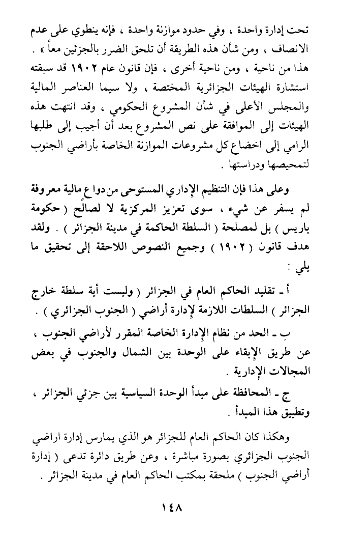 تحت إدارة واحدة، وفي حدود موازنة واحدة، فإنه ينطوي على عدم الانصاف، ومن شأن هذه الطريقة أن تلحق الضرر بالجزئين معا). هذا من ناحية، ومن ناحية أخرى، فإن قانون عام 1902 قد سبقته استشارة الهيئات الجزائرية المختصة، ولا سيما العناصر المالية والمجلس الأعلى في شأن المشروع الحكومي، وقد انتهت هذه الهيئات إلى الموافقة على نص المشروع بعد أن أجيب إلى طلبها الرامي إلى اخضاع كل مشروعات الموازنة الخاصة بأراضي الجنوب لتمحيصها ودراستها.
