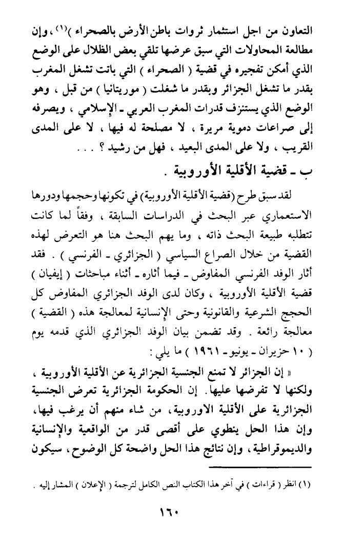 التعاون من اجل استمثار ثروات باطن الأرض بالصحراء) (¬1)، وإن مطالعة المحاولات التي سبق عرضها تلقي بعض الظلال على الوضع الذي أمكن تفجيره في قضية (الصحراء) التي باتت تشغل المغرب بقدر ما تشغل الجزائر وبقدر ما شغلت (موريتانيا) من قبل، وهو الوضع الذي يستنزف قدرات المغرب العربي - الإسلامي، ويصرفه إلى صراعات دموية مريرة، لا مصلحة له فيها، لا على المدى القريب، ولا على المدى البعيد، فهل من رشيد؟ ...