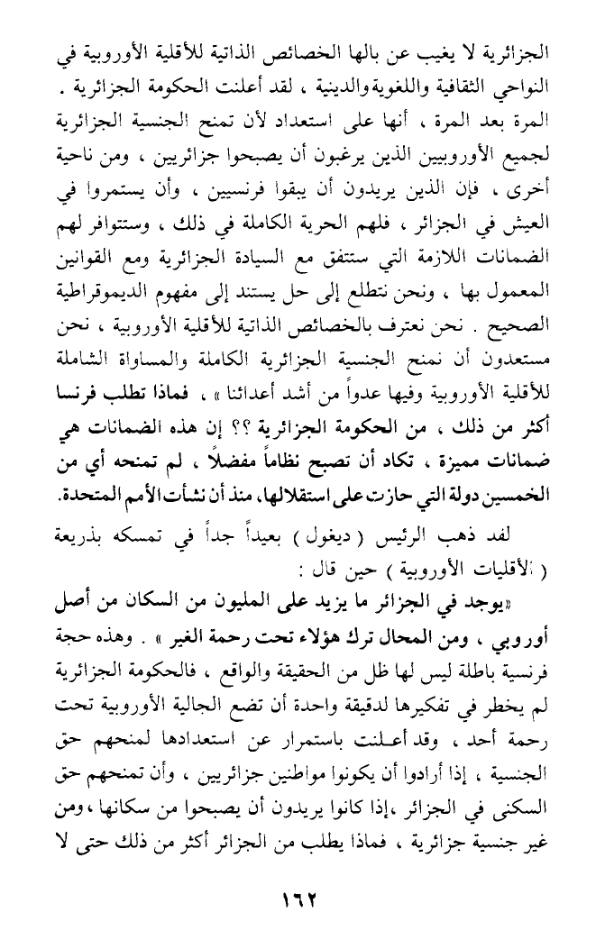 الجزائرية لا يغيب عن بالها الخصائص الذاتية للأقلية الأوروبية في النواحي الثقافية واللغوية والدينية، لقد أعلنت الحكومة الجزائرية. المرة بعد المرة، أنها على استعداد لأن تمنح الجنسية الجزائرية لجميع الأوروبيين الذين يرغبون أن يصبحوا جزائريين، ومن ناحية أخرى، فإن الذين يريدون أن يبقوا فرنسيين، وأن يستمروا في العيش في الجزائر، فلهم الحرية الكاملة في ذلك، وستتوافر لهم الضمانات اللازمة التي ستتفق مع السيادة الجزائرية ومع القوانين المعمول بها، ونحن نتطلع إلى حل يستند إلى مفهوم الديموقراطية الصحيح. نحن نعترف بالخصائص الذاتية للأقلية الأوروبية، نحن مستعدون أن نمنح الجنسية الجزائرية الكاملة والمساواة الشاملة للأقلية الأوروبية وفيها عدوا من أشد أعدائنا)، فماذا تطلب فرنسا أكثر من ذلك، من الحكومة الجزائرية؟؟ إن هذه الضمانات هي ضمانات مميزة، تكاد أن تصبح نظاما مفضلا، لم تمنحه أي من الخمسين دولة التي حازت على استقلالها، منذ أن نشأت الأمم المتحدة.