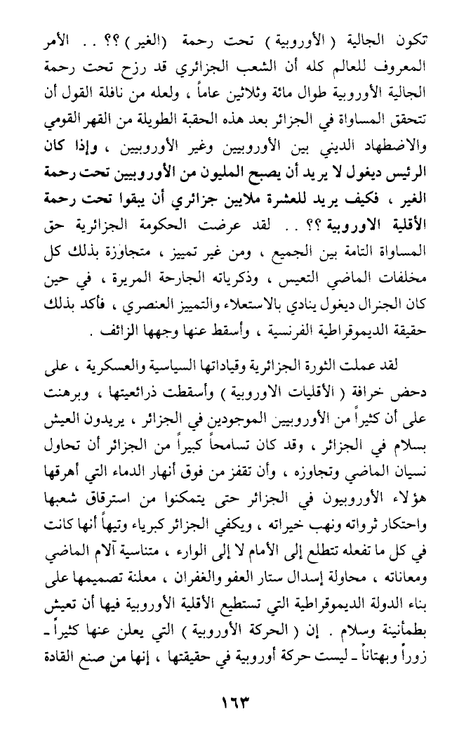 تكون الجالية (الأوروبية) تحت رحمة (الغير)؟؟ .. الأمر المعروف للعالم كله أن الشعب الجزائري قد رزح تحت رحمة الجالية الأوروبية طوال مائة وثلاثين عاما، ولعله من نافلة القول أن تتحقق المساواة في الجزائر بعد هذه الحقبة الطويلة من القهر القومي والاضطهاد الديني بين الأوروبيين وغير الأوروبيين، وإذا كان الرئيس ديغول لا يريد أن يصبح المليون من الأوروبيين تحت رحمة الغير، فكيف يريد للعشرة ملايين جزائري أن يبقوا تحت رحمة الأقلية الأوروبية؟؟ .. لقد عرضت الحكومة الجزائرية حق المساواة التامة بين الجميع، ومن غير تمييز، متجاوزة بذلك كل مخلفات الماضي التعيس، وذكرياته الجارحة المريرة، في حين كان الجنرال ديغول ينادي بالاستعلاء والتمييز العنصري، فأكد بذلك حقيقة الديموقراطية الفرنسية، وأسقط عنها وجهها الزائف.