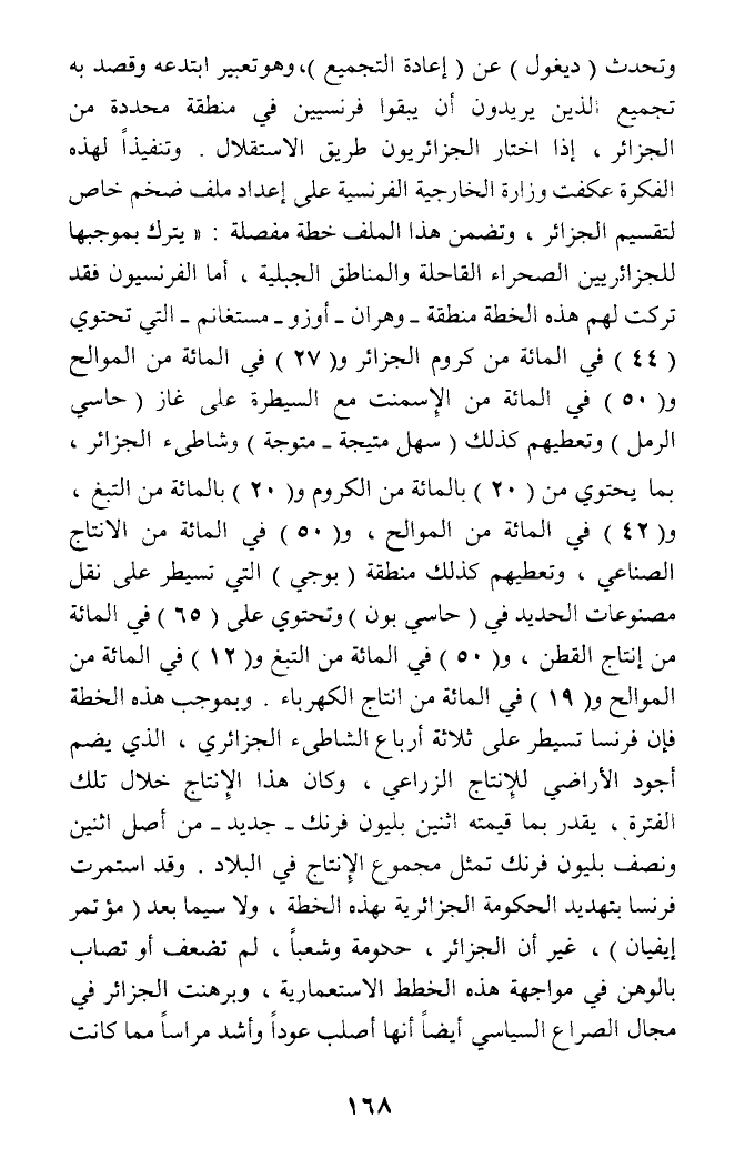 وتحدث (ديغول) عن (إعادة التجميع)، وهو تعبير ابتدعه وقصد به تجميع الذين يريدون أن يبقوا فرنسيين في منطقة محددة من الجزائر، إذا اختار الجزائريون طريق الاستقلال. وتنفيذا لهذه الفكرة عكفت وزارة الخارجية الفرنسية على إعداد ملف ضخم خاص لتقسيم الجزائر، وتضمن هذا الملف خطة مفصلة: (يترك بموجبها للجزائريين الصحراء القاحلة والمناطق الجبلية، أما الفرنسيون فقد تركت لهم هذه الخطة منطقة - وهران - أرزو - مستغانم - التي تحتوي (44) في المائة من كروم الجزائر و (27) في المائة من الموالح و (50) في المائة من الإسمنت مع السيطرة على غاز (حاسي الرمل) وتعطيهم كذلك (سهل متيجة - متوجة) وشاطىء الجزائر، بما يحتوي من (20) بالمائة من الكروم و (20) بالمائة من التبغ، و (42) في المائة من الموالح، و (50) في المائة من الانتاج الصناعي، وتعطيهم كذلك منطقة (بوجي) التي تسيطر على نقل مصنوعات الحديد في (حاسي بون) وتحتوي على (60) في المائة من إنتاج القطن، و (50) في المائة من التبغ و (12) في المائة من الموالح و (19) في المائة من انتاج الكهرباء. وبموجب هذه الخطة فإن فرنسا تسيطر على ثلاثة أرباع الشاطىء الجزائري، الذي يضم أجود الأراضي للانتاج الزراعي، وكان هذا الإنتاج خلال تلك الفترة، يقدر بما قيمته اثنين بليون فرنك - جديد - من أصل اثنين ونصف بليون فرنك تمثل مجموع الإنتاج في البلاد. وقد استمرت فرنسا بتهديد الحكومة الجزائرية لهذه الخطة، ولا سيما بعد (مؤتمر إيفيان)، غير أن الجزائر، حكومة وشعبا، لم تضعف أو تصاب بالوهن في مواجهة هذه الخطط الاستعمارية، وبرهنت الجزائر فى مجال الصراع السياسي أيضا أنها أصلب عودا وأشد مراسا مما كانت