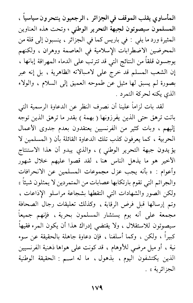 لقد بات لزاما علينا أن نصرف النظر عن الدعاوة الرسمية التي باتت ترهق حتى الذين يفرزونها (بهمة) بقدر ما ترهق الذين توجه إليهم، وبات كثير من الفرنسيين يعتقدون بعدم جدوى الأعمال الحربية، كما يعرفون كذب تلك الدعاوة القائلة بأن (المسلمين لا يؤيدون جبهة التحرير الوطني)، والذي يبدو أن هذا الاستنتاج الأخير هو ما يذهل الناس هنا، لقد قصوا عليهم خلال شهور وأعوام: (بأنه يجب عزل مجموعات المسلمين عن الانحرافات والجرائم التي تقوم بارتكابها عصابات من المتمردين لا يمثلون شيئا) ولكن الصور والشهادات التي التقطها بشجاعة مراسلو الإذاعات، وتم إرسالها قبل فرض الرقابة، وكذلك تعليقات رجال الصحافة مجمعة على أنه يوم يستشار المسلمون بحرية، فإنهم جميعا سيصوتون للاستقلال، ولا يقتضي إدراك هذا أن يكون المرء فقيها كبيرا، ولكن، وكما أسلفنا، فإن دعاوة جاهلة بالحقيقة عن سوء نية، أو ميل مرضي للأوهام، قد كونت على هواها ذهنية الفرنسيين الذين يكتشفون اليوم، بذهول، ما له اسم: الحقيقة الوطنية