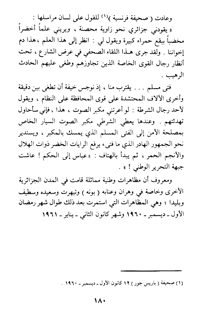 (يقودني جزائري نحو زاوية محصنة، ويريني علما أخضرا مخضبا ببقع حمراء كبيرة ويقول لي: انظر إلى هذا العلم، هذا دم إخواننا. ولقد جرى هذا اللقاء الصحفي في عرض الشارع، تحت أنظار رجال القوى الخاصة الذين تجاوزهم وطغى عليهم الحادث الرهيب.