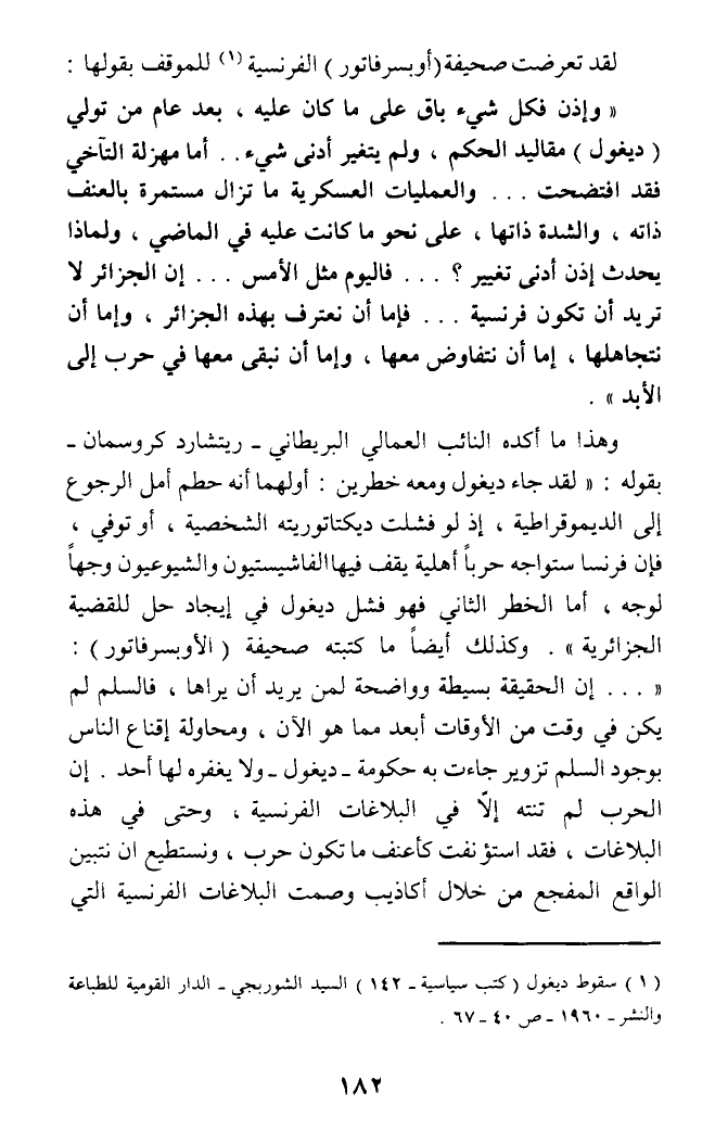 (وإذن فكل شيء باق على ما كان عليه، بعد عام من تولي (ديغول) مقاليد الحكم، ولم يتغير أدنى شيء .. أما مهزلة التآخي فقد افتضحت ... والعمليات العسكرية ما تزال مستمرة بالعنف ذاته، والشدة ذاتها، على نحو ما كانت عليه في الماضي، ولماذا يحدث إذن أدنى تغيير؟ .. 0 فاليوم مثل الأمس ... إن الجزائر لا تريد أن تكون فرنسية ... فإما أن نعترف بهذه الجزائر، وإما أن نتجاهلها، إما أن نتفاوض معها، وإما أن نبقى معها في حرب إلى الأبد).
