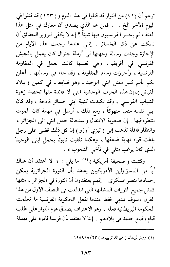 تزعم أن (71) من الثوار قد قتلوا في هذا اليوم و (123) قد قتلوا في اليوم الآخر الخ ... فمن هو الذي يصدق أن معارك في مثل هذا العنف لم يخسر الفرنسيون فيها شيئا؟ إنه لا يكفي لتزوير الحقاثق أن نسكت عن ذكر الخسائر. إنني عندما رجعت هذه الأيام من الإجازة وجدت رسالة وجهتها لي أرملة جنرال كان يعمل بالجيش الفرنسي في أفريقيا، وهي نفسها كانت تعمل في المقاومة الفرنسية، وأحرزت وسام المقاومة، وقد جاء في رسالتها: أعلن لكم بألم كبير مقتل ابني الوحيد - وهو ضابط - في كمين (ببلاد القبائل)، إن هذه الحرب الوحشية التي لا فائدة منها تحصد زهرة الشباب الفرنسي، وقد تكبدت كتيبة ابني خسائر فادحة، وقد كان ابني نفسه متعبا منهوكا، ومع ذلك، أرسل في مهمة كان الموت ينتظره فيها. إن صعوبة الانتقال واستحالة حمل ابني الى الجزائر، وانتظار قافلة تذهب إلى (تيزي أوزو) إن كل ذلك قضى على رجل بلغت قواه نهاية ضعفها، وهكذا تلقت تابوتا يحمل ابني الوحيد الذي كان يرغب مثلي في تآخي الشعوب).