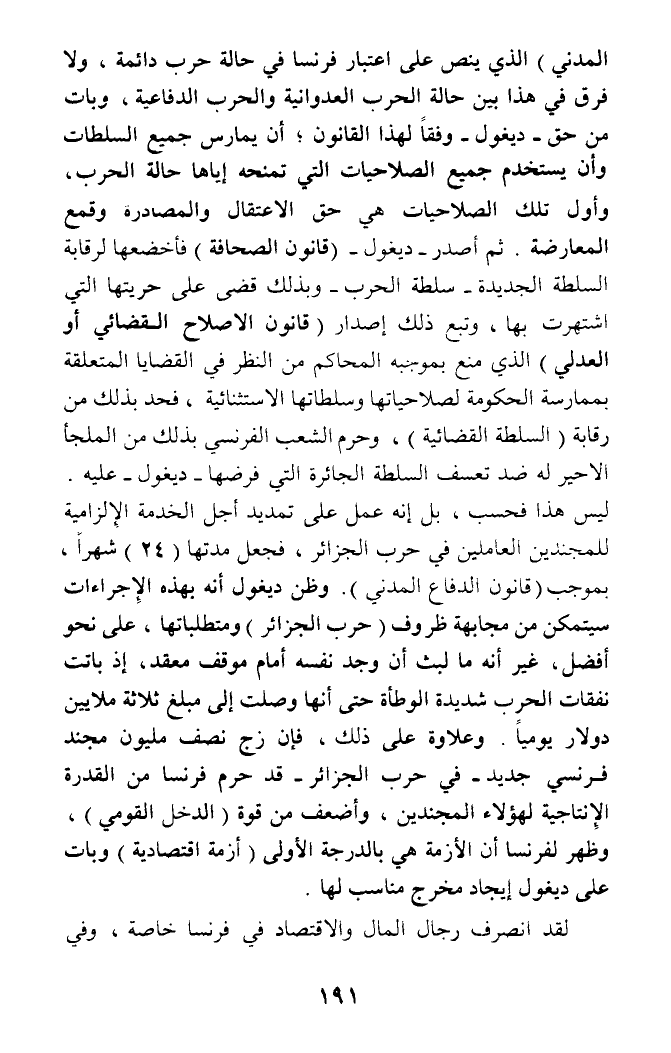 المدني) الذي ينص على اعتبار فرنسا في حالة حرب دائمة، ولا فرق في هذا بين حالة الحرب العدوانية والحرب الدفاعية، وبات من حق - ديغول - وفقا لهذا القانون؛ أن يمارس جميع السلطات وأن يستخدم جميع الصلاحيات التي تمنحه إياها حالة الحرب، وأول تلك الصلاحيات هي حق الاعتقال والمصادرة وقمع المعارضة. ثم أصدر - ديغول - (قانون الصحافة) فأخضعها لرقابة السلطة الجديدة - سلطة الحرب - وبذلك قضى على حريتها التي اشتهرت بها، وتبع ذلك إصدار (قانون الاصلاح القضائي أو العدلي) الذي منع بموجبه المحاكم من النظر في القضايا المتعلقة بممارسة الحكومة لصلاحياتها وسلطاتها الاستثنائية، فحد بذلك من رقابة (السلطة القضائية)، وحرم الشعب الفرنسي بذلك من الملجأ الأخير له ضد تعسف السلطة الجائرة التي فرضها - ديغول - عليه. ليس هذا فحسب، بل إنه عمل على تمديد أجل الخدمة الإلزامية