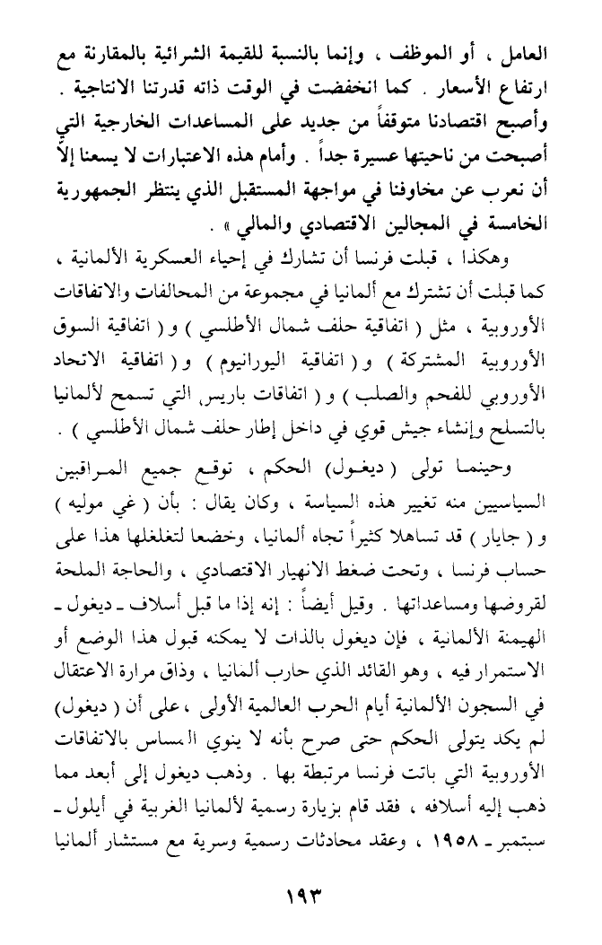 العامل، أو الموظف، وإنما بالنسبة للقيمة الشرائية بالمقارنة مع ارتفاع الأسعار. كما انخفضت في الوقت ذاته قدرتنا الانتاجية. وأصبح اقتصادنا متوقفا من جديد على المساعدات الخارجية التي أصبحت من ناحيتها عسيرة جدا. وأمام هذه الاعتبارات لا يسعنا إلا أن نعرب عن مخاوفنا في مواجهة المستقبل الذي ينتظر الجمهورية الخامسة في المجالين الاقتصادي والمالي).