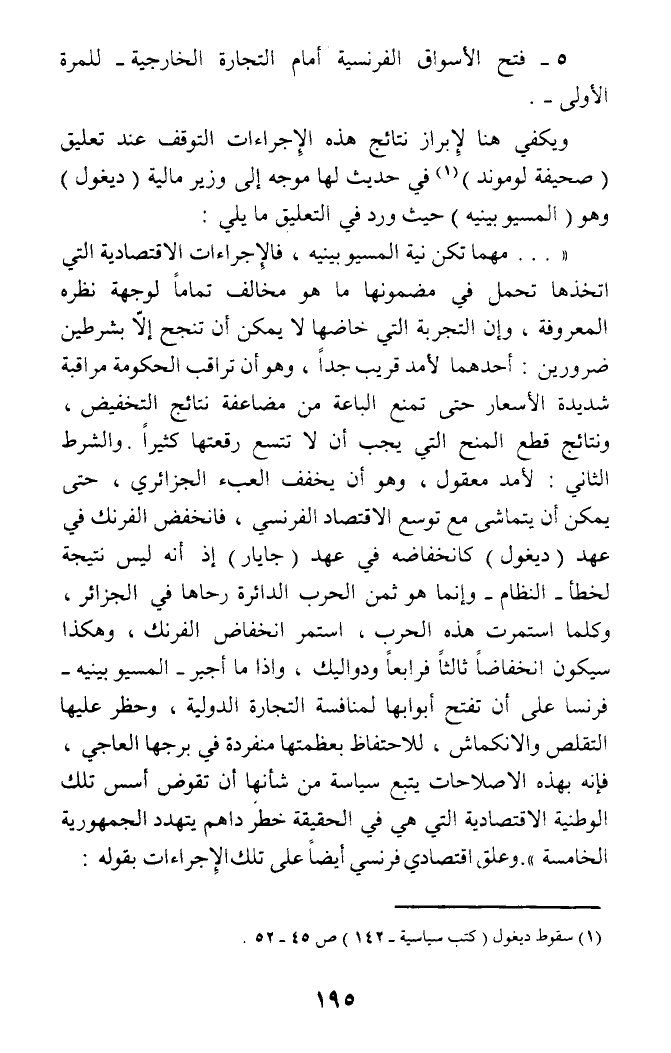 (... مهما تكن نية المسيو بينيه، فالإجراءات الاقتصادية التي اتخذها تحمل في مضمونها ما هو مخالف تماما لوجهة نظره المعروفة، وإن التجربة التي خاضها لا يمكن أن تنجح إلا بشرطين ضرورين: أحدهما لأمد قريب جدا، وهو أن تراب الحكومة مراقبة شديدة الأسعار حتى تمنع الباعة من مضاعفة نتائج التخفيض، ونتائج قطع المنح التي يجب أن لا تتسع رقعتها كثيرا. والشرط الثاني: لأمد معقول، وهو أن يخفف العبء الجزائري، حتى يمكن أن يتماشى مع توسع الاقتصاد الفرنسي، فانخفض الفرنك في عهد (ديغول) كانخفاضه في عهد (جايار) إذ أنه ليس نتيجة لخطأ - النظام - وإنما هو ثمن الحرب الدائرة رحاها في الجزائر، وكلما استمرت هذه الحرب، استمر انخفاض الفرنك، وهكذا سيكون انخفاضا ثالثا فرابعا ودواليك، واذا ما أجبر - المسيو بينيه -فرنسا على أن تفتح أبوابها لمنافسة التجارة الدولية، وحظر عليها التقلص والانكماش، للاحتفاط بعظمتها منفردة في برجها العاجي، فإنه بهذه الاصلاحات يتبع سياسة من شأنها أن تقوض أسس تلك الوطنية الاقتصادية التي هي في الحقيقة خطر داهم يتهدد الجمهورية الخامسة). وعلق اقتصادي فرنسي أيضا على تلك الإجراءات بقوله: