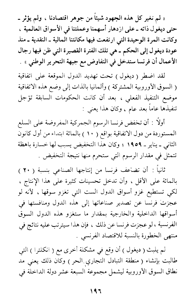 (لم تغير كل هذه الجهود شيئا من جوهر اقتصادنا، ولم يؤثر - حتى ديغول، ذاته - على ازدهار أسهمنا وعملتنا في الأسواق العالمية، وكانت المرة الوحيدة التي ارتفعت فيها مكانتنا المالية - النقدية - منذ عودة ديغول إلى الحكم - هي تلك الفترة القصيرة التي ظن فيها رجال الأعمال أن فرنسا ستدخل في التفاوض مع جبهة التحرير الوطني).
